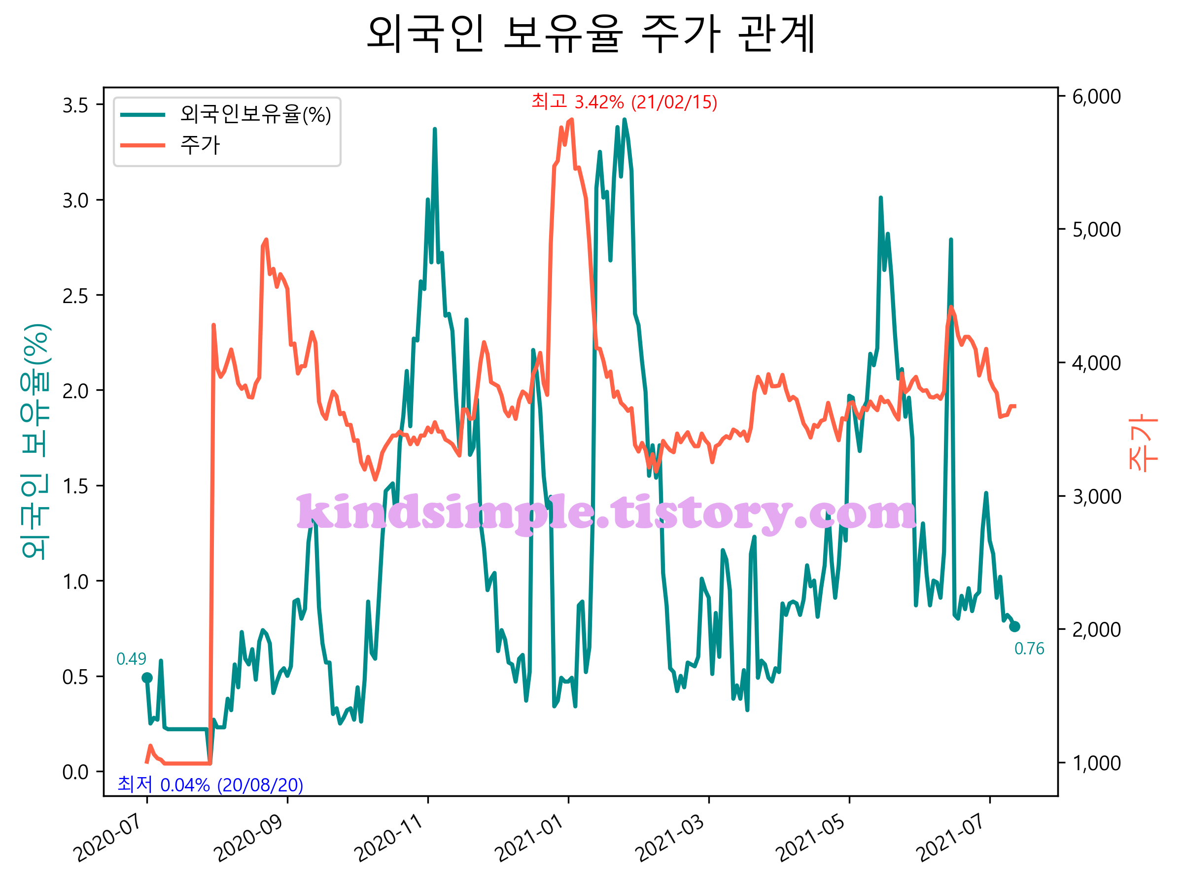 최근 1년간 외국인 보유율 및 주가와의 관계입니다.