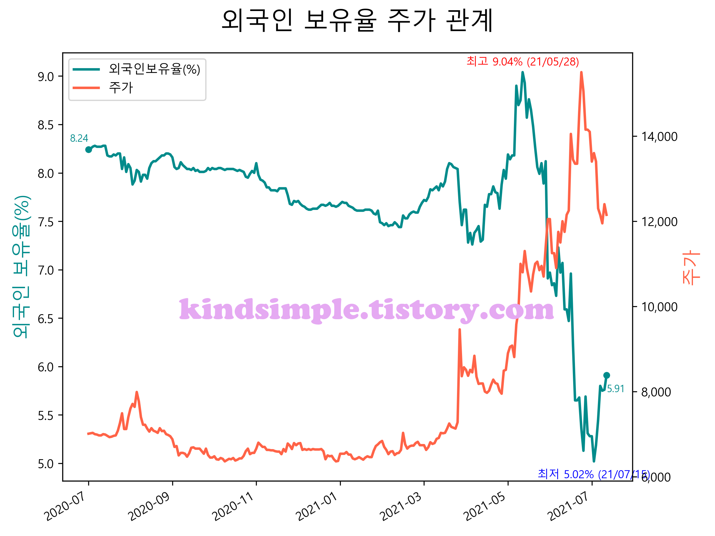 최근 1년간 외국인 보유율 및 주가와의 관계입니다.