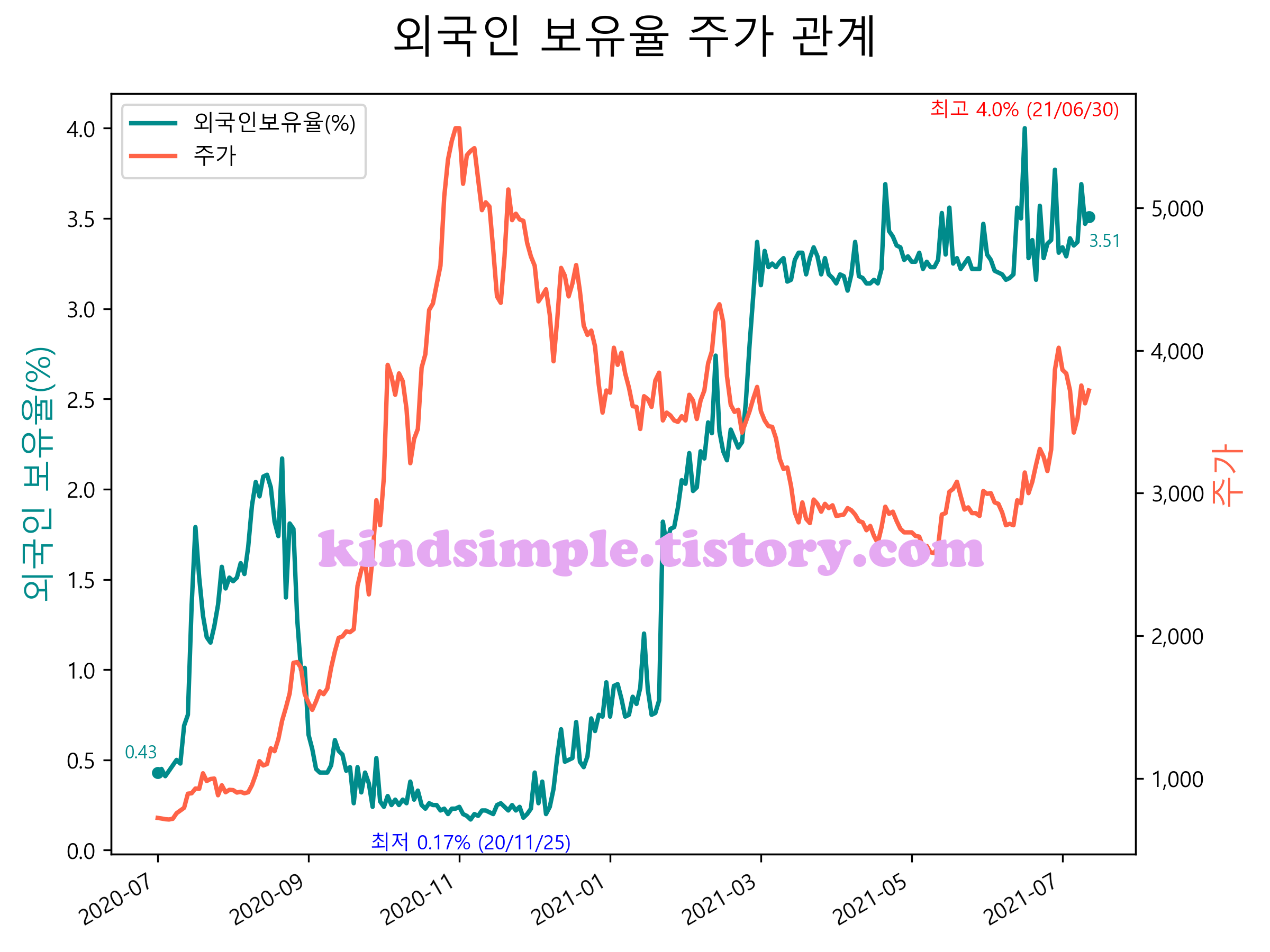 최근 1년간 외국인 보유율 및 주가와의 관계입니다.