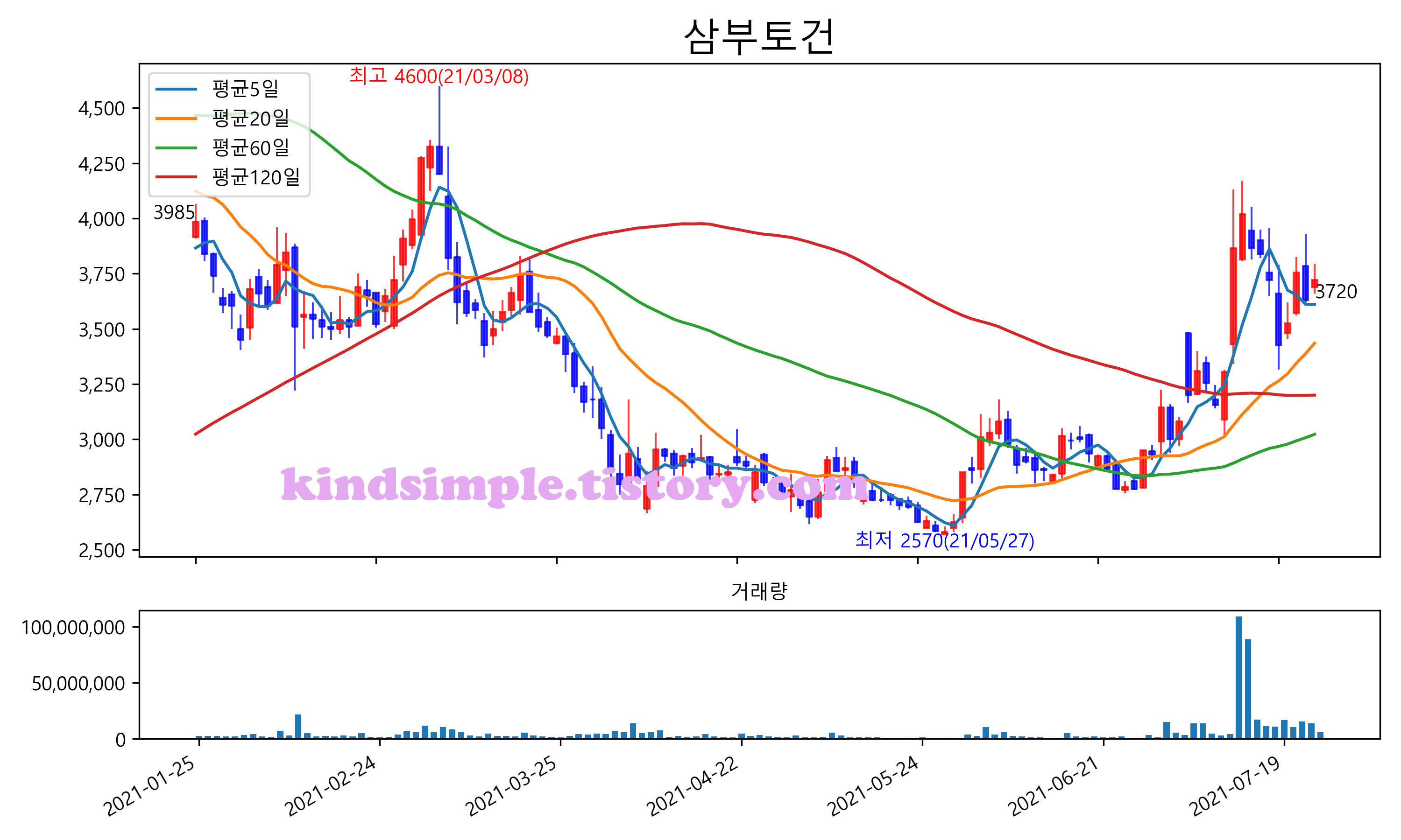최근 6개월간 캔들차트 및 이동평균선입니다.