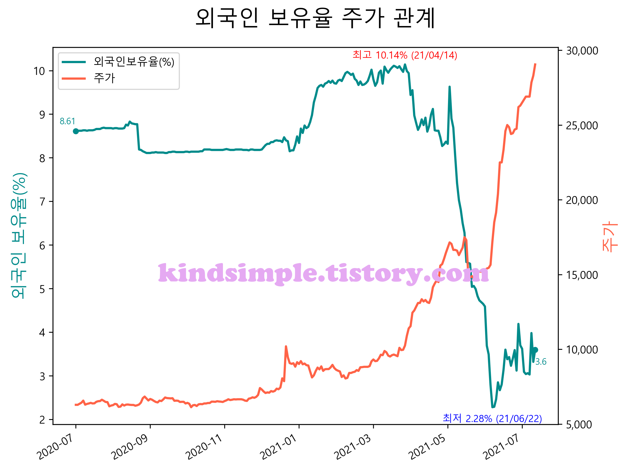 최근 1년간 외국인 보유율 및 주가와의 관계입니다.
