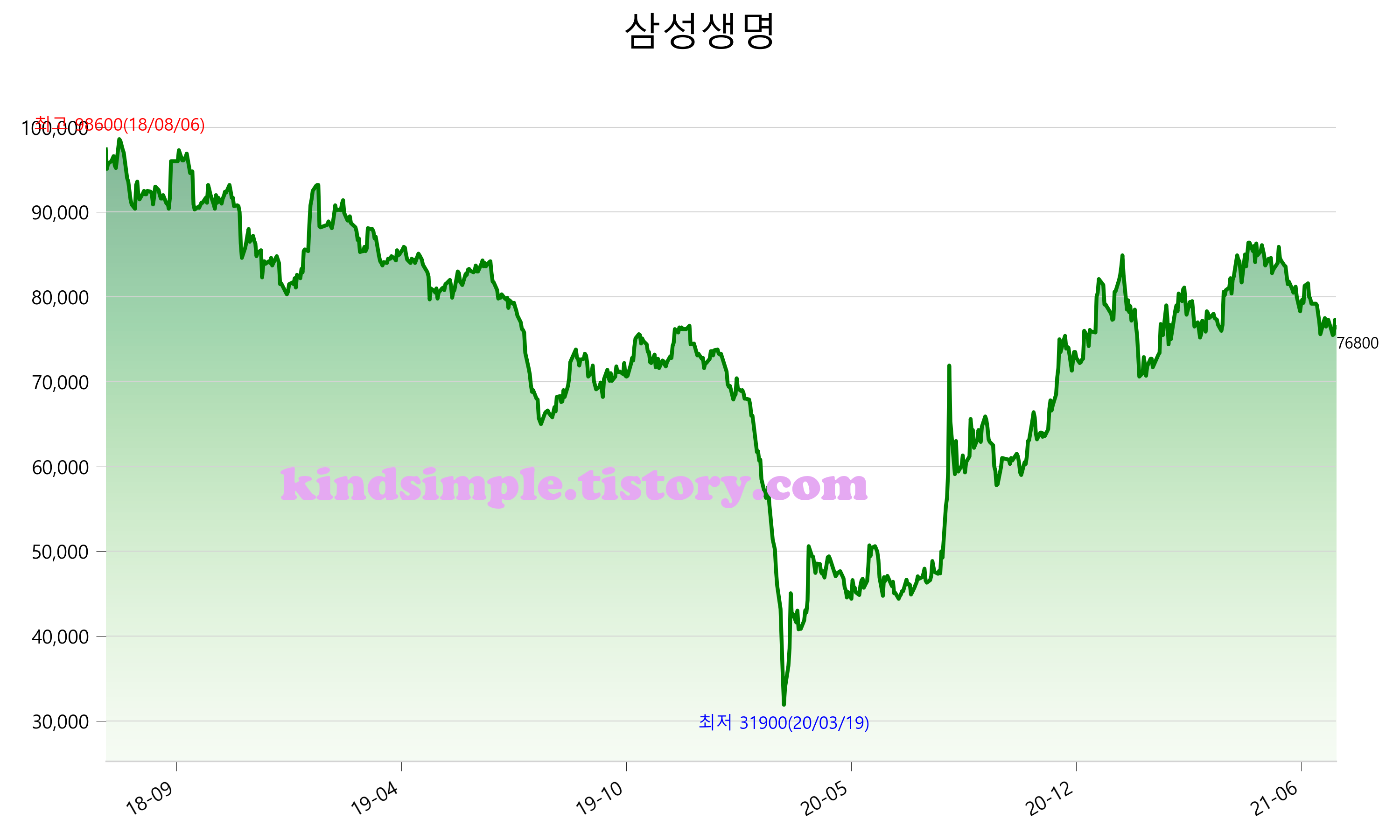 7월 23일 기준 주가는 76,800원 입니다. 아래는 최근 3년간의 주가흐름입니다.