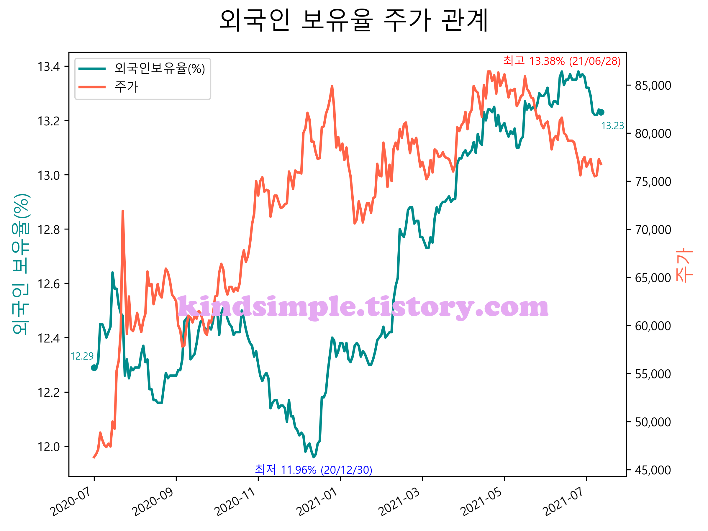 최근 1년간 외국인 보유율 및 주가와의 관계입니다.