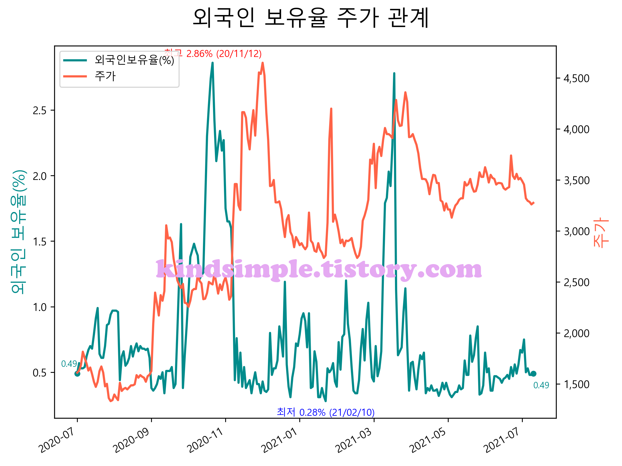 최근 1년간 외국인 보유율 및 주가와의 관계입니다.