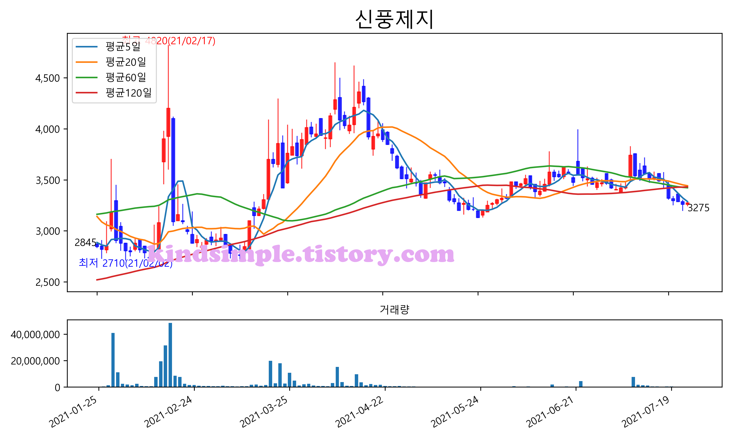 최근 6개월간 캔들차트 및 이동평균선입니다.