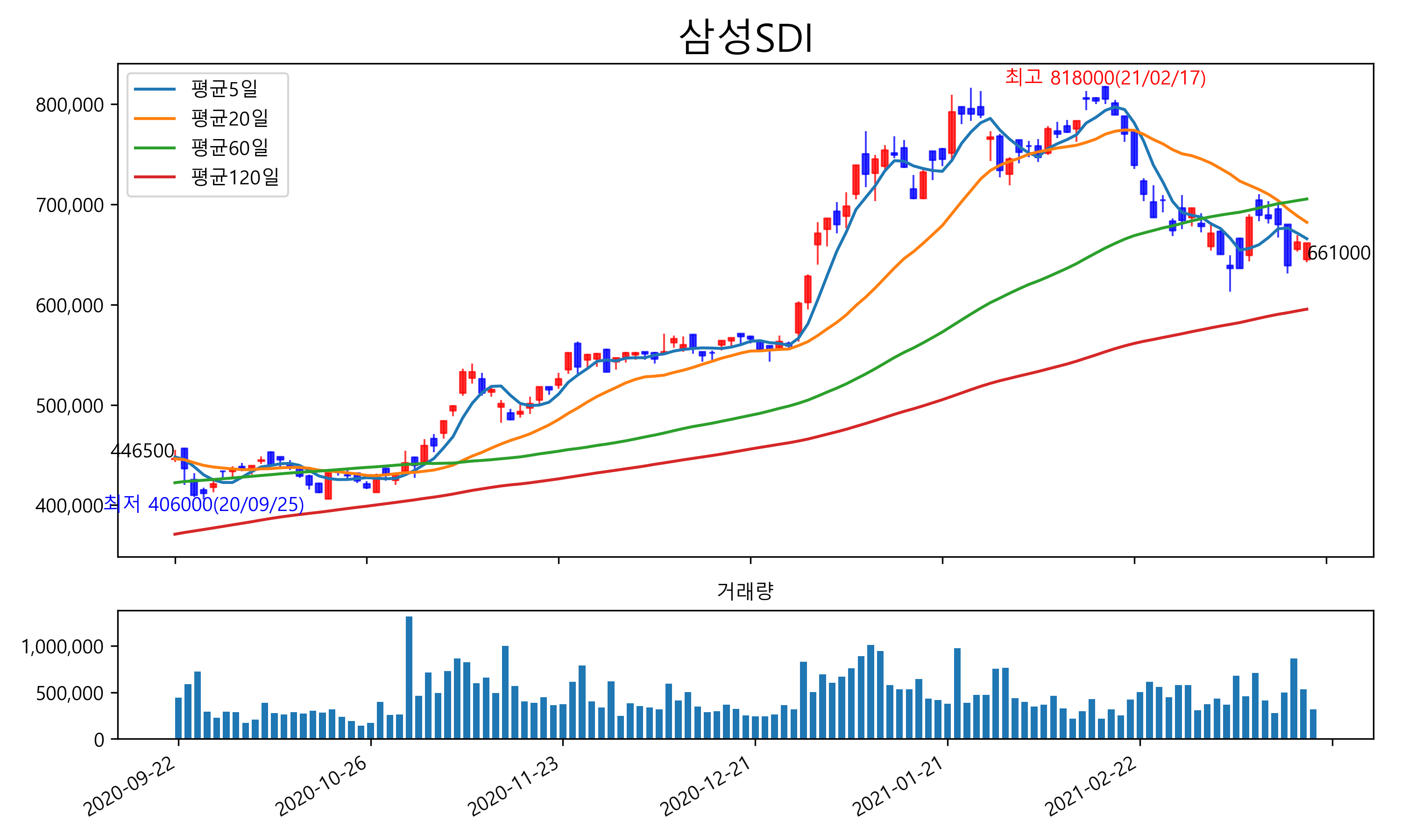 최근 6개월간 캔들차트 및 이동평균선입니다.