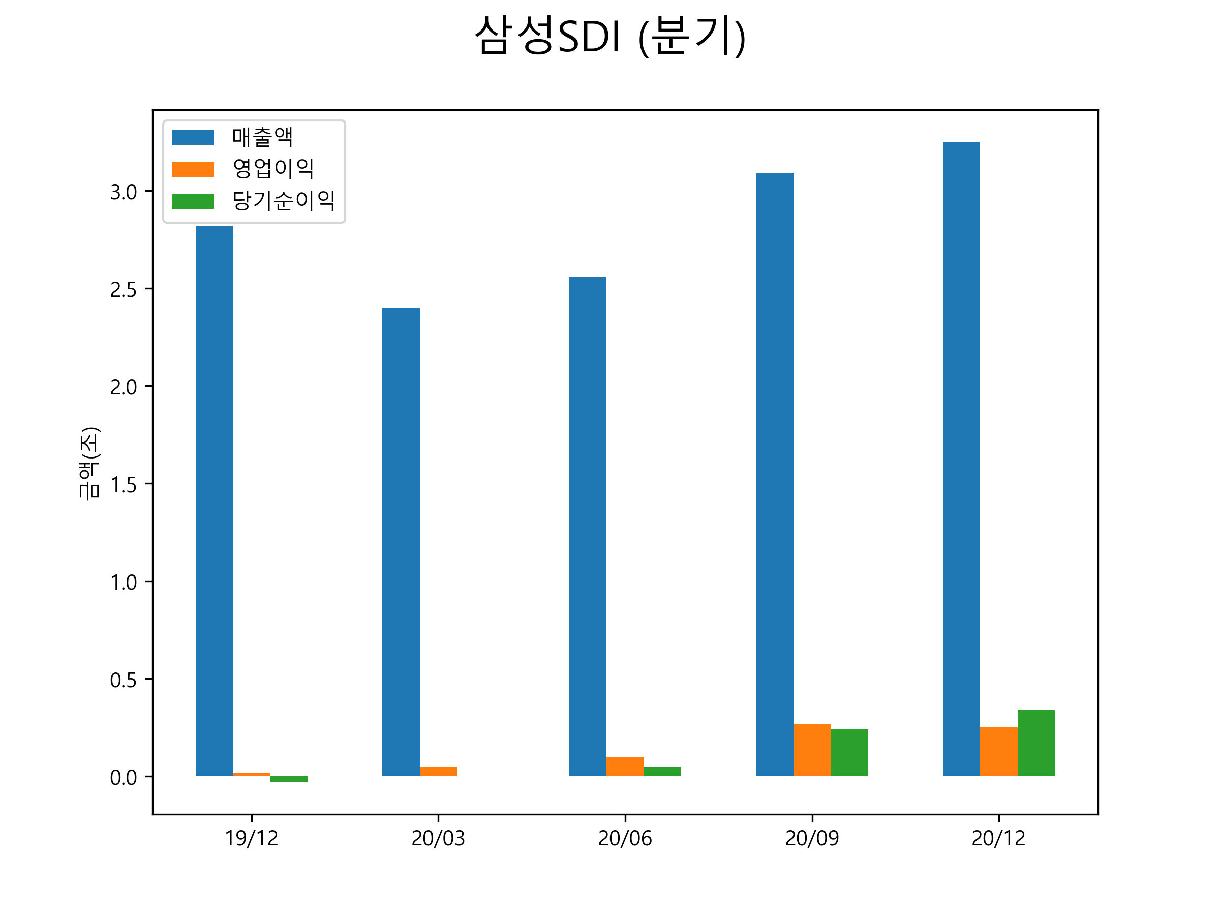 삼성SDI의 2020년 4분기 매출은 3조 2514억원, 영업이익 2462억원, 당기순이익 3419억원을 기록했습니다. 삼성SDI의 분기별 매출 및 영업이익, 당기순이익 표입니다.