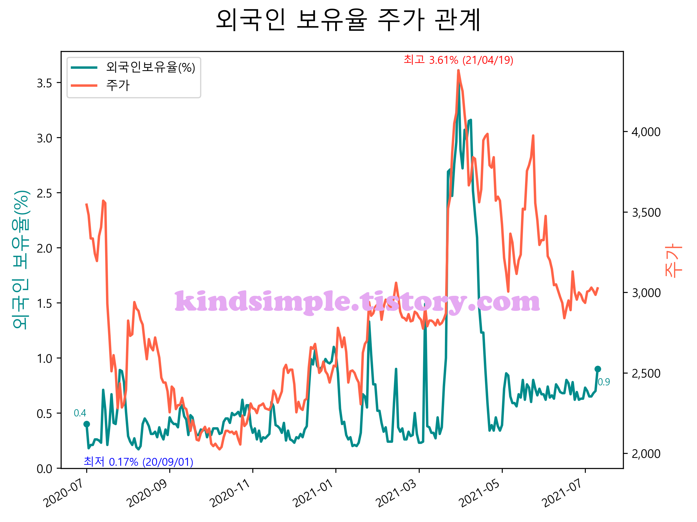 최근 1년간 외국인 보유율 및 주가와의 관계입니다.