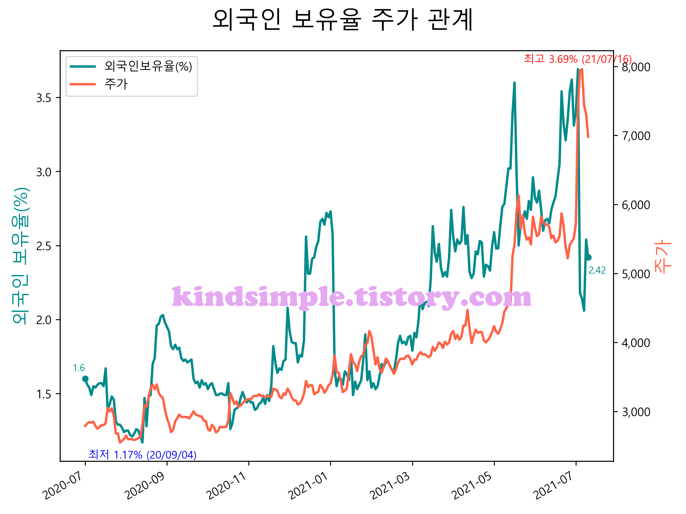 최근 1년간 외국인 보유율 및 주가와의 관계입니다.