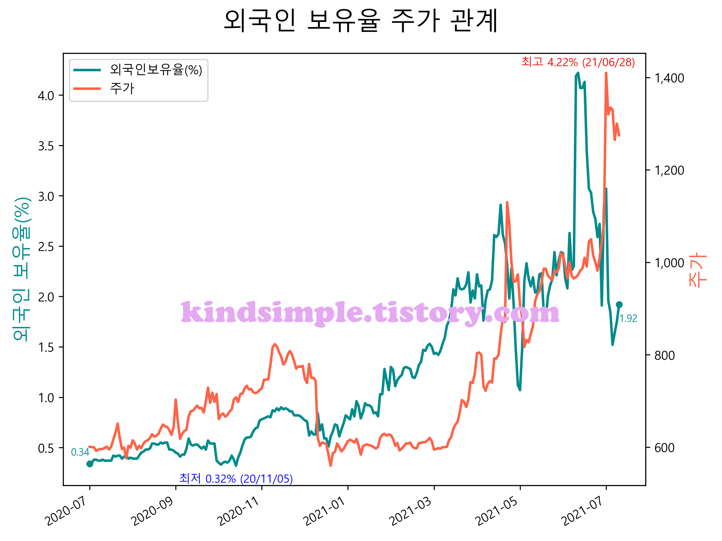 최근 1년간 외국인 보유율 및 주가와의 관계입니다.
