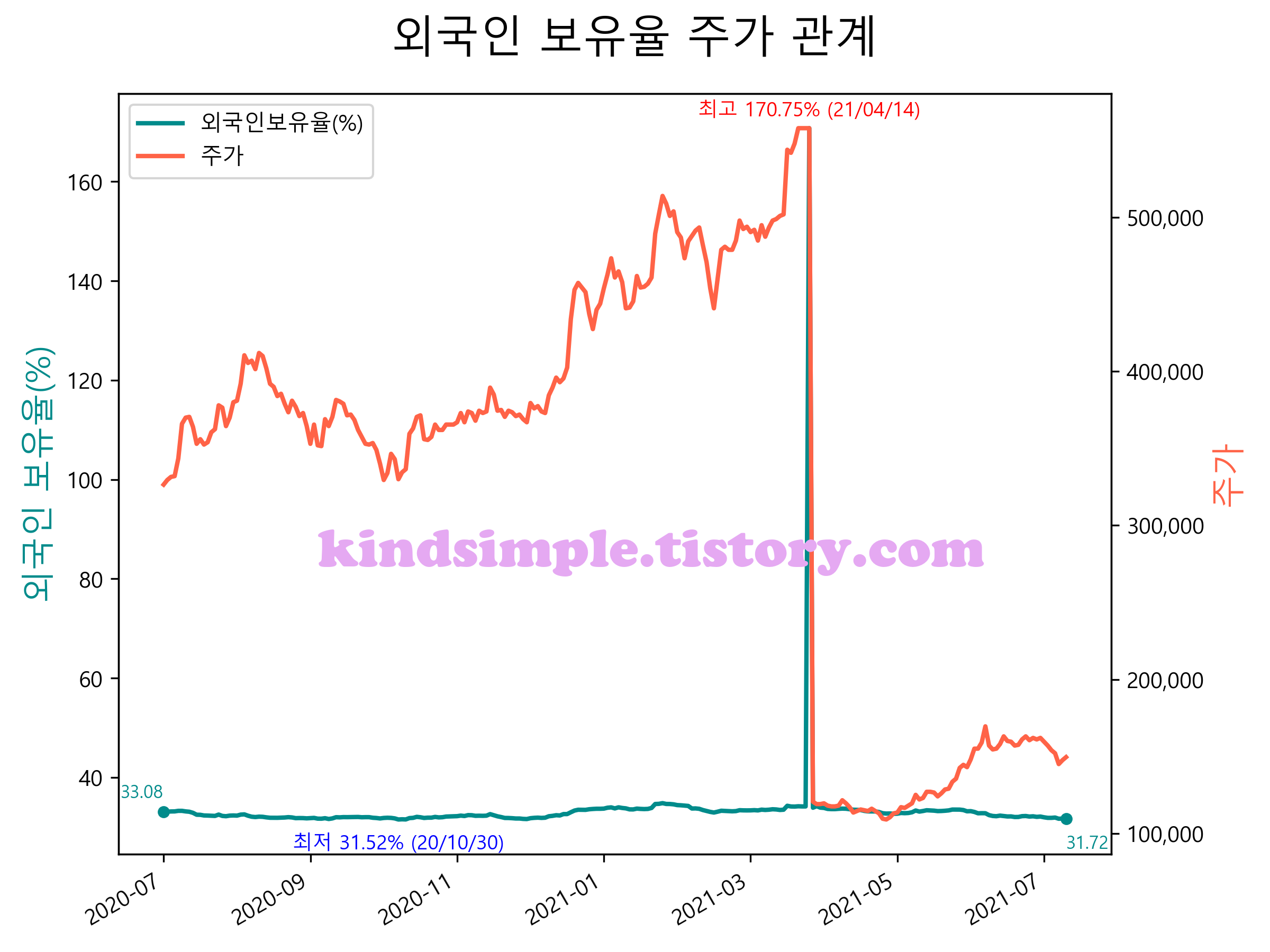 최근 1년간 외국인 보유율 및 주가와의 관계입니다.
