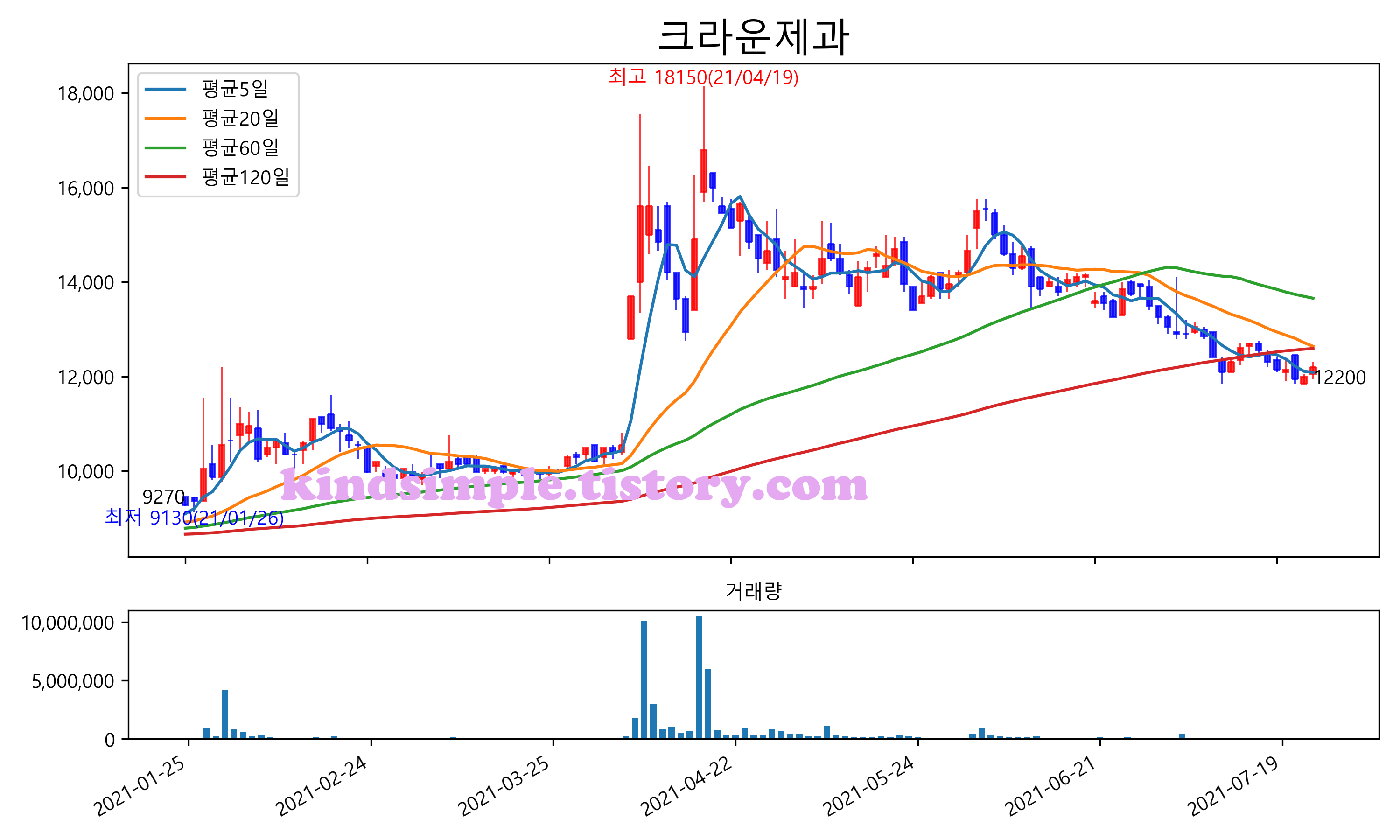 최근 6개월간 캔들차트 및 이동평균선입니다.