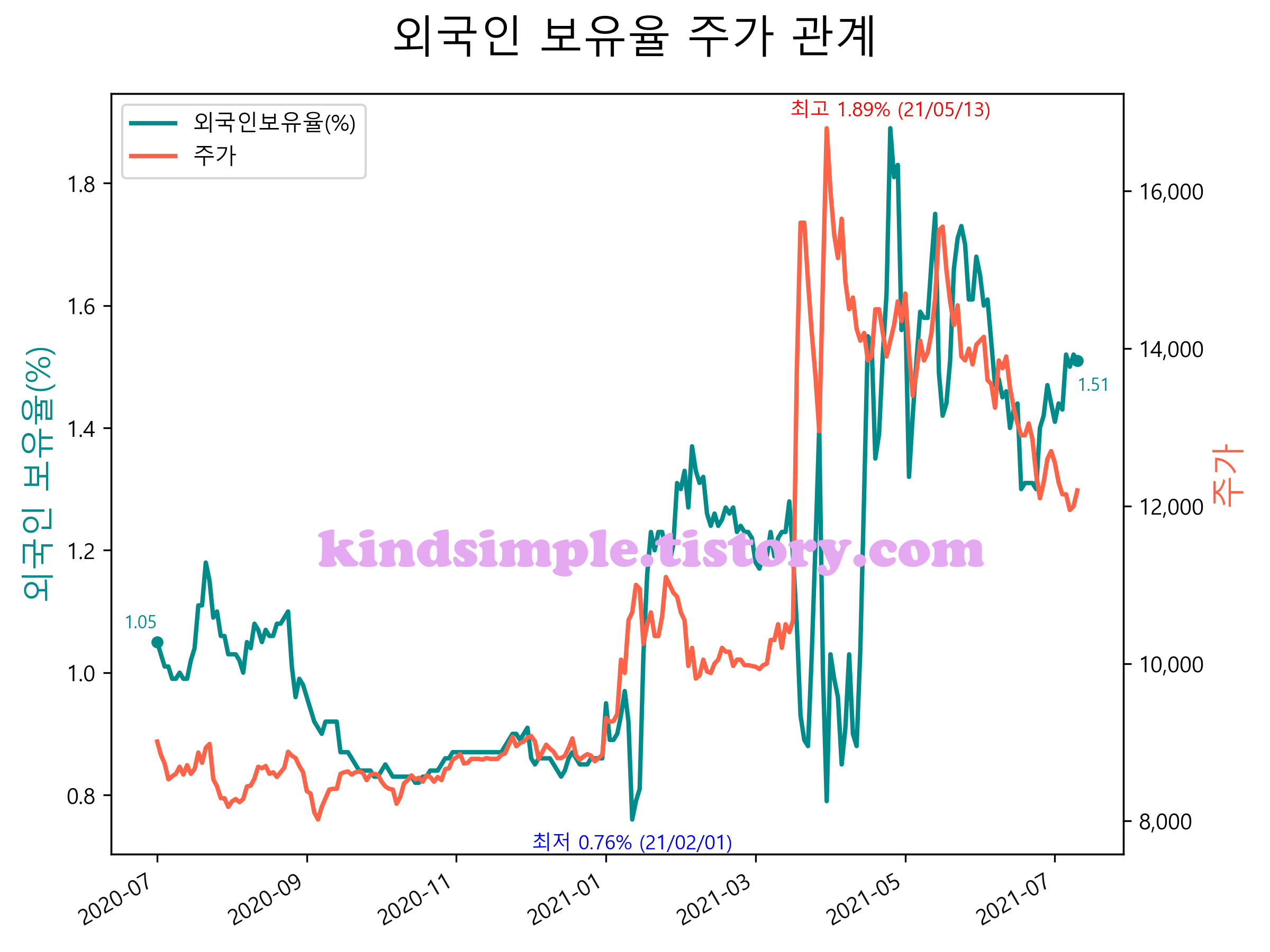최근 1년간 외국인 보유율 및 주가와의 관계입니다.