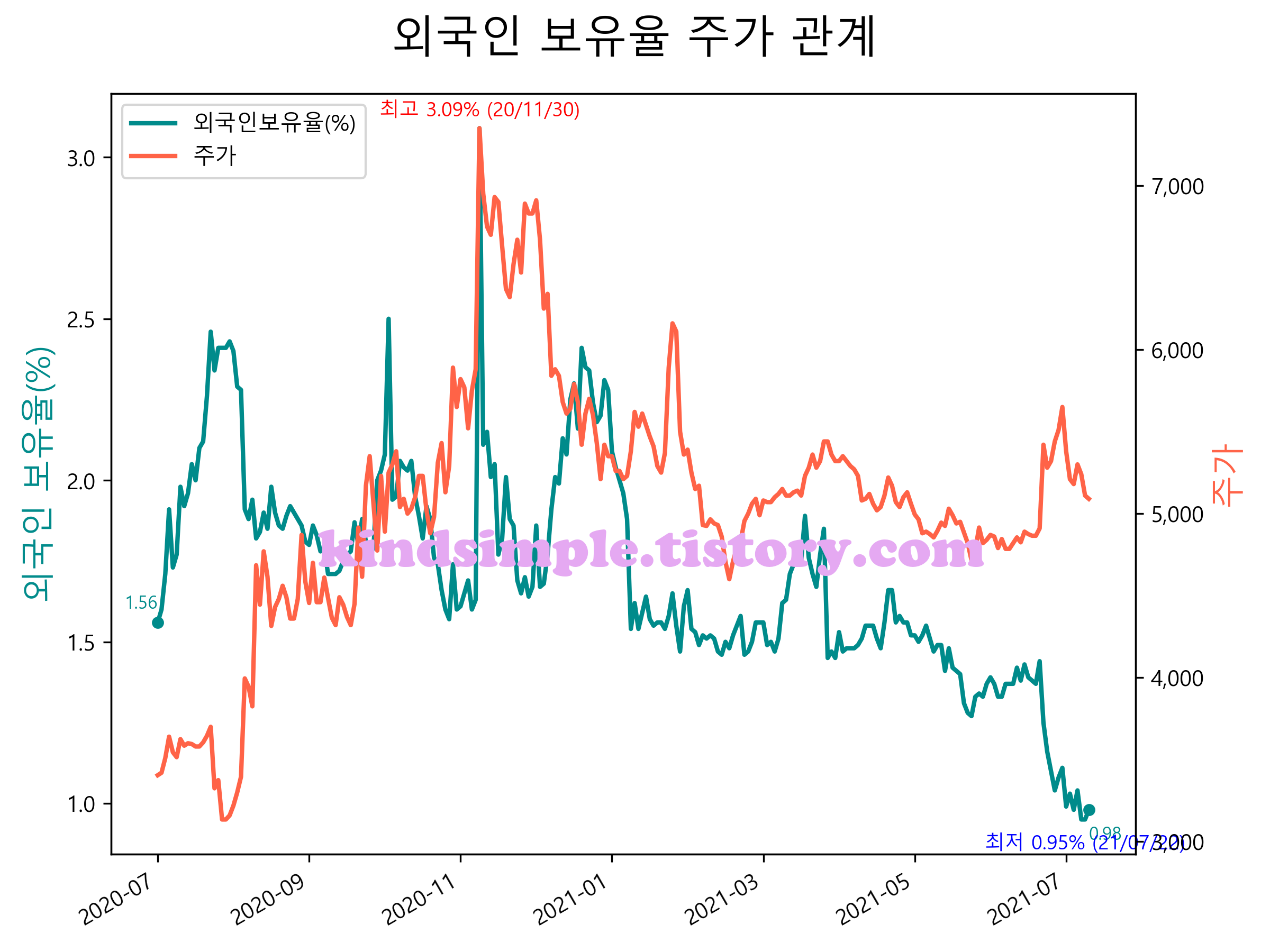 최근 1년간 외국인 보유율 및 주가와의 관계입니다.