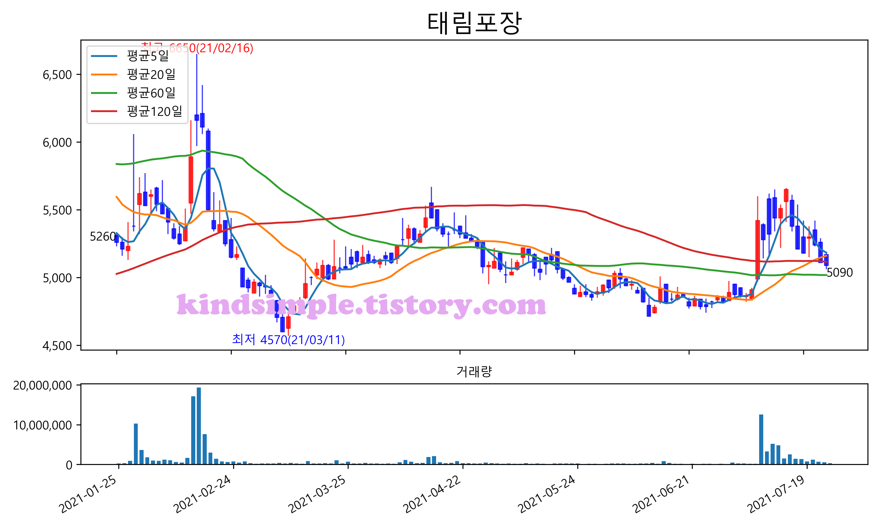 최근 6개월간 캔들차트 및 이동평균선입니다.