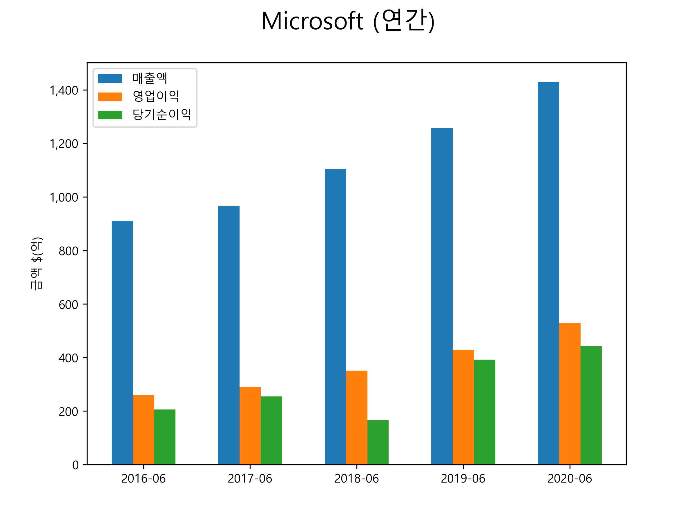 Microsoft의 2020년 매출은 1430.2억달러, 영업이익 529.6억달러, 당기순이익 442.8억달러을 기록했습니다. 연간별 매출 및 영업이익, 당기순이익 표입니다.