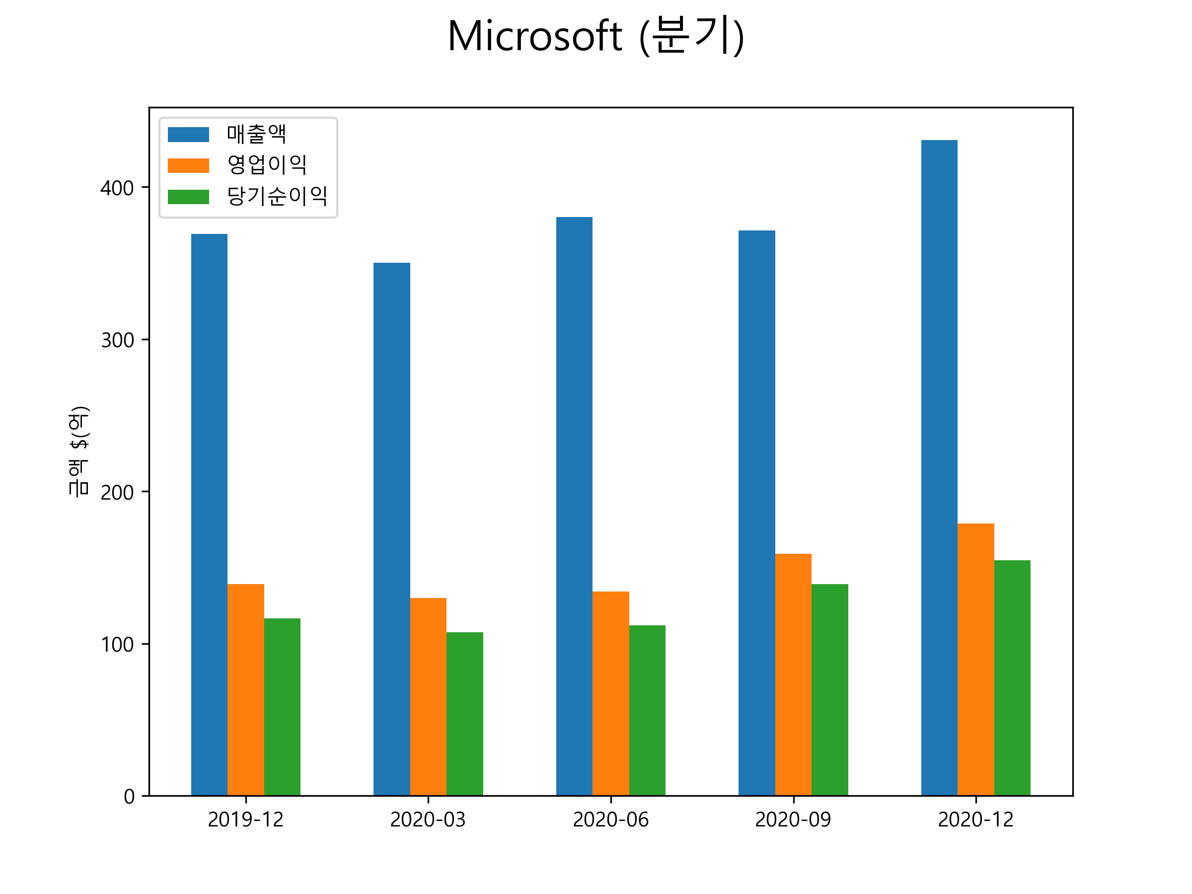 Microsoft의 2020년 3분기 매출은 430.8억달러, 영업이익 179.0억달러, 당기순이익 154.6억달러을 기록했습니다. 분기별 매출 및 영업이익, 당기순이익 표입니다.