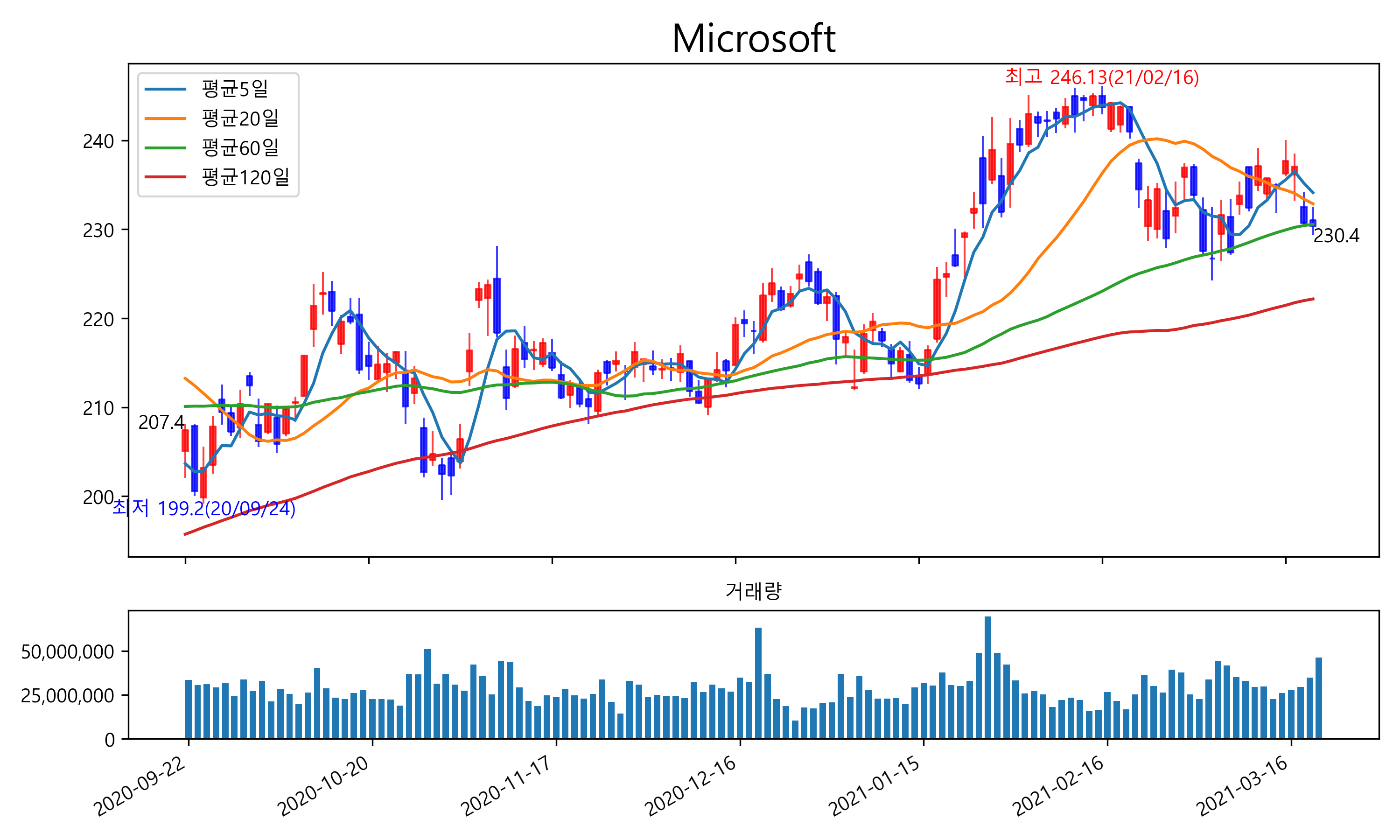 최근 6개월간 캔들차트 및 이동평균선입니다.