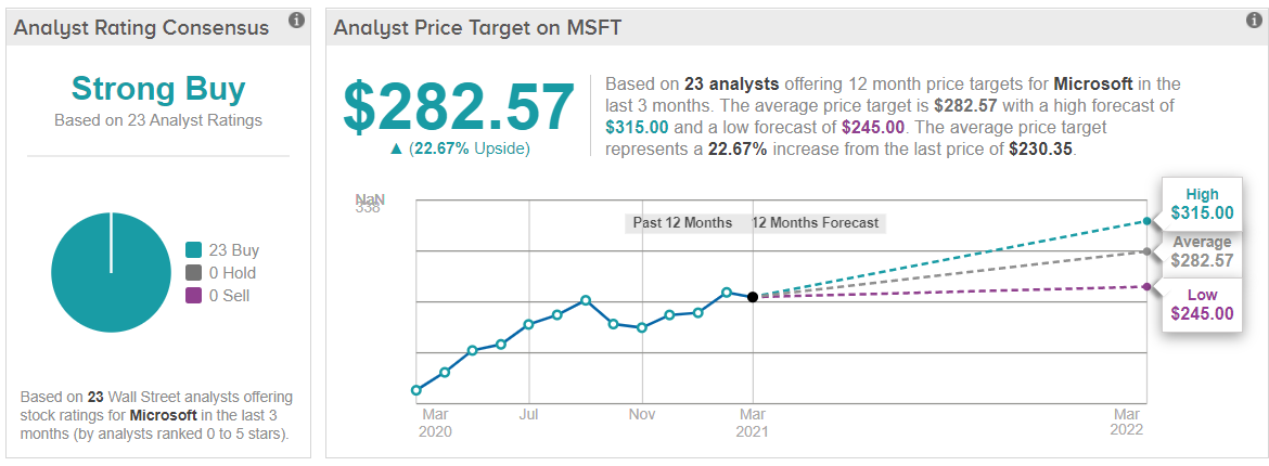 마이크로소프트의 미국 투자자들의 투자의견입니다. 지난 3개월 동안 총 23명의 애널리스트가 목표가를 추정하였습니다. 목표주가는 $282.57로 현재주가 $230.35보다 22.67% 상승할 것으로 전망했습니다. 가장 높은 목표주가는 $315.00이며, 가장 낮은 목표주가는 $245.00입니다.
