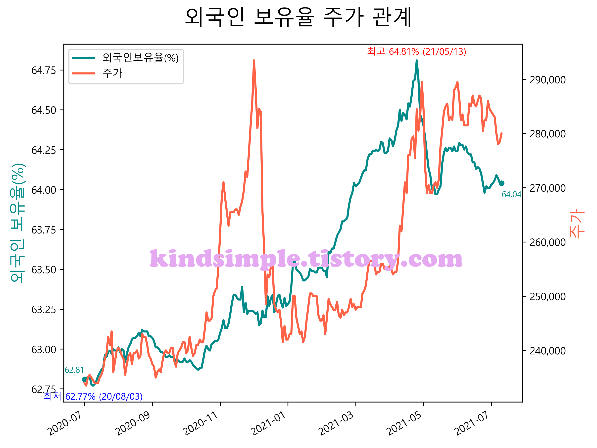 최근 1년간 외국인 보유율 및 주가와의 관계입니다.