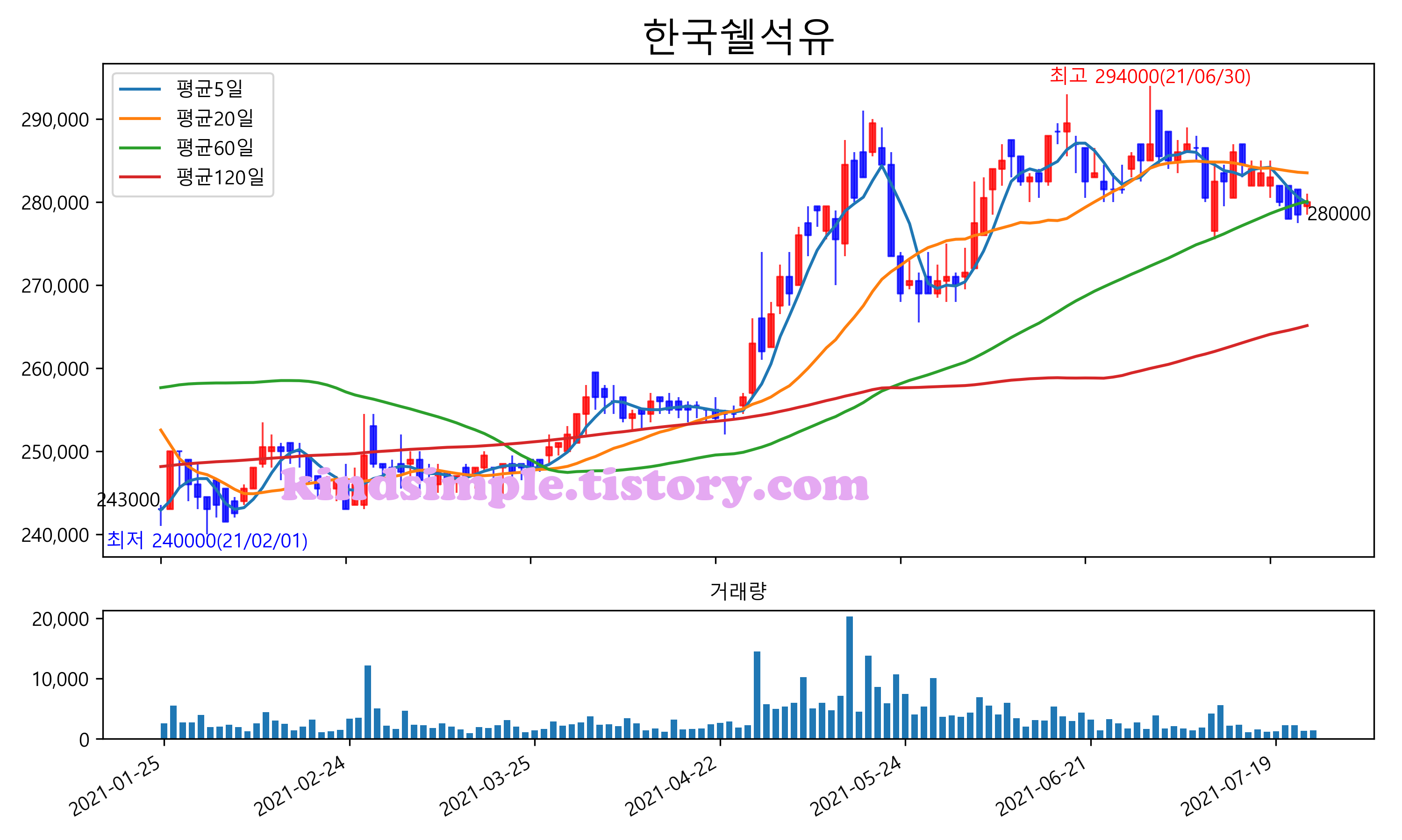 최근 6개월간 캔들차트 및 이동평균선입니다.