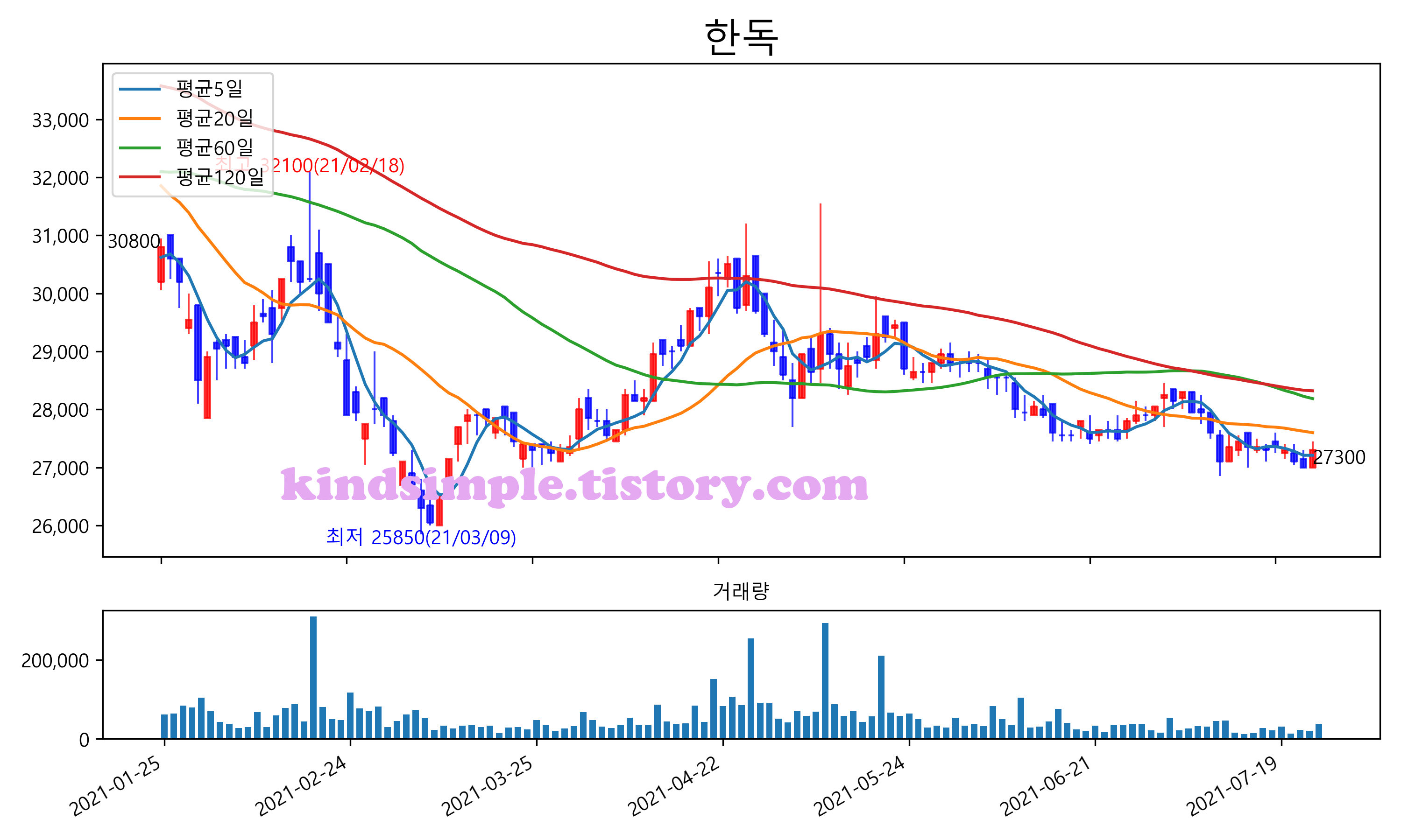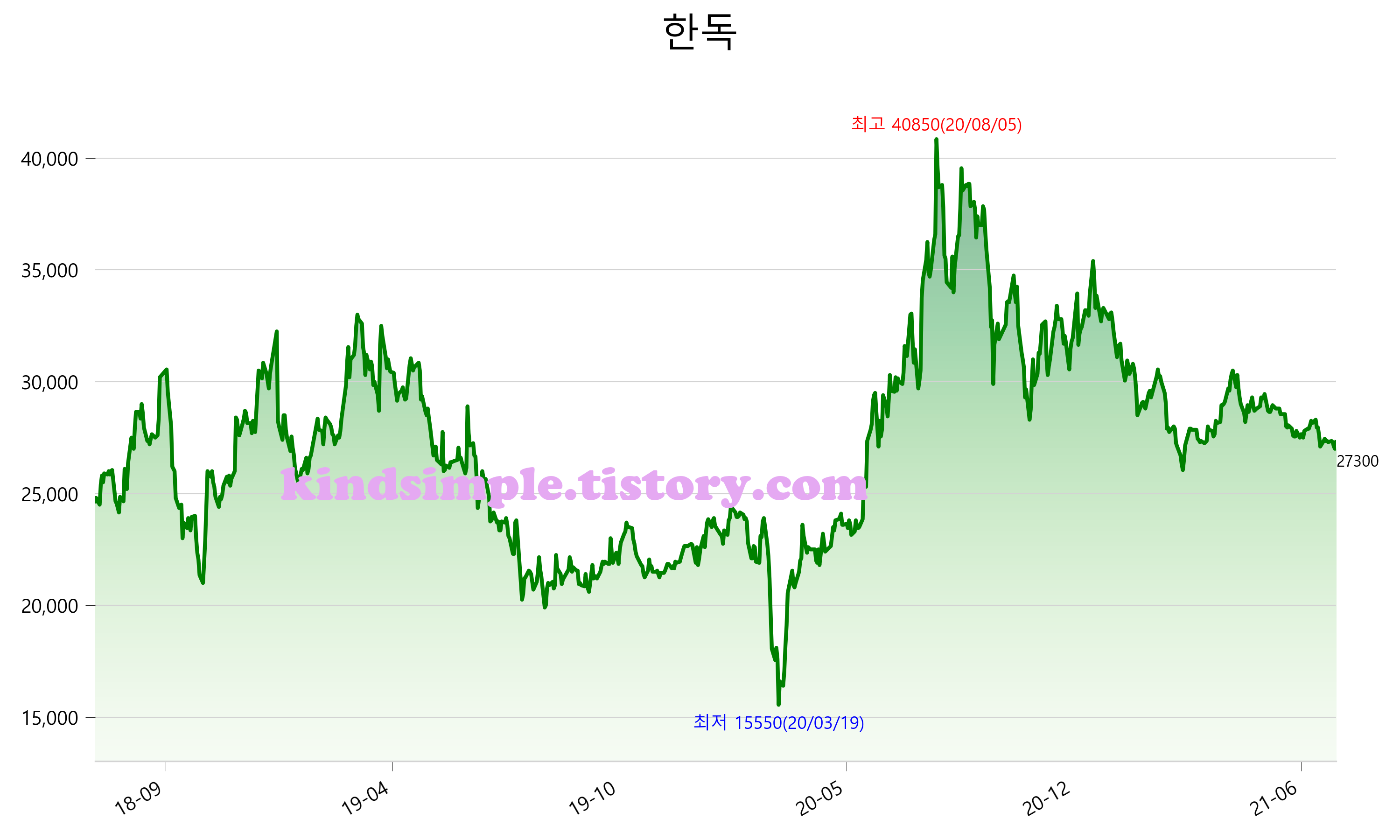 7월 24일 기준 주가는 27,300원 입니다. 아래는 최근 3년간의 주가흐름입니다.