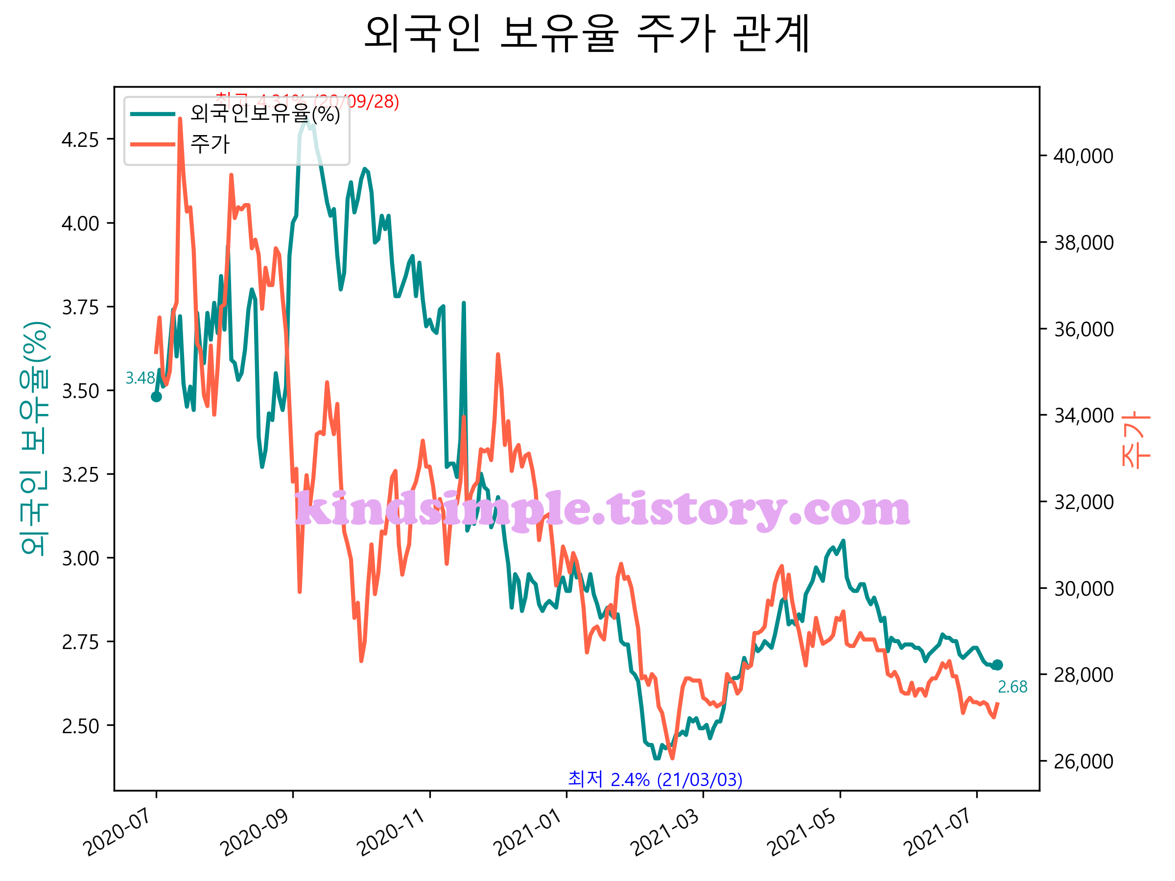 최근 1년간 외국인 보유율 및 주가와의 관계입니다.