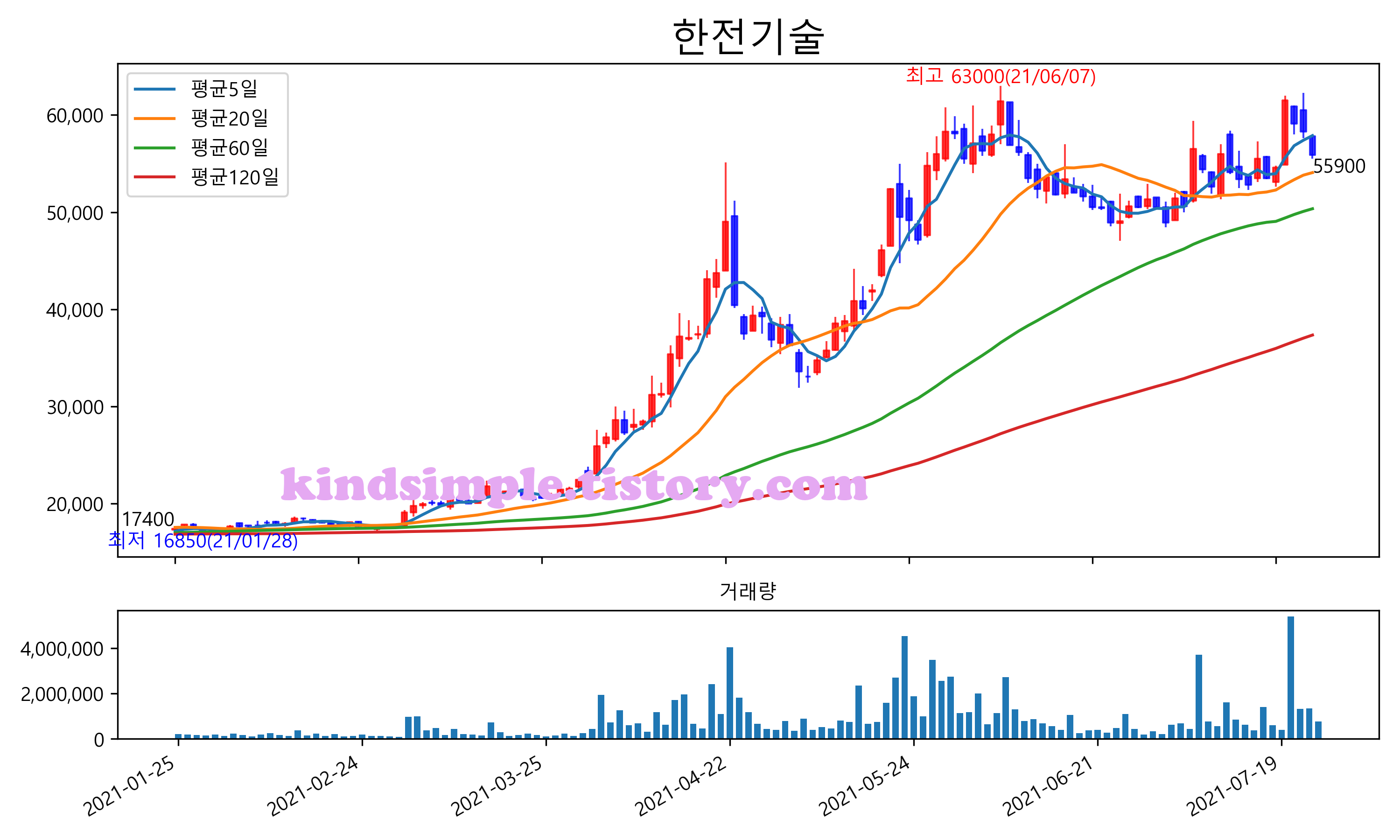 최근 6개월간 캔들차트 및 이동평균선입니다.