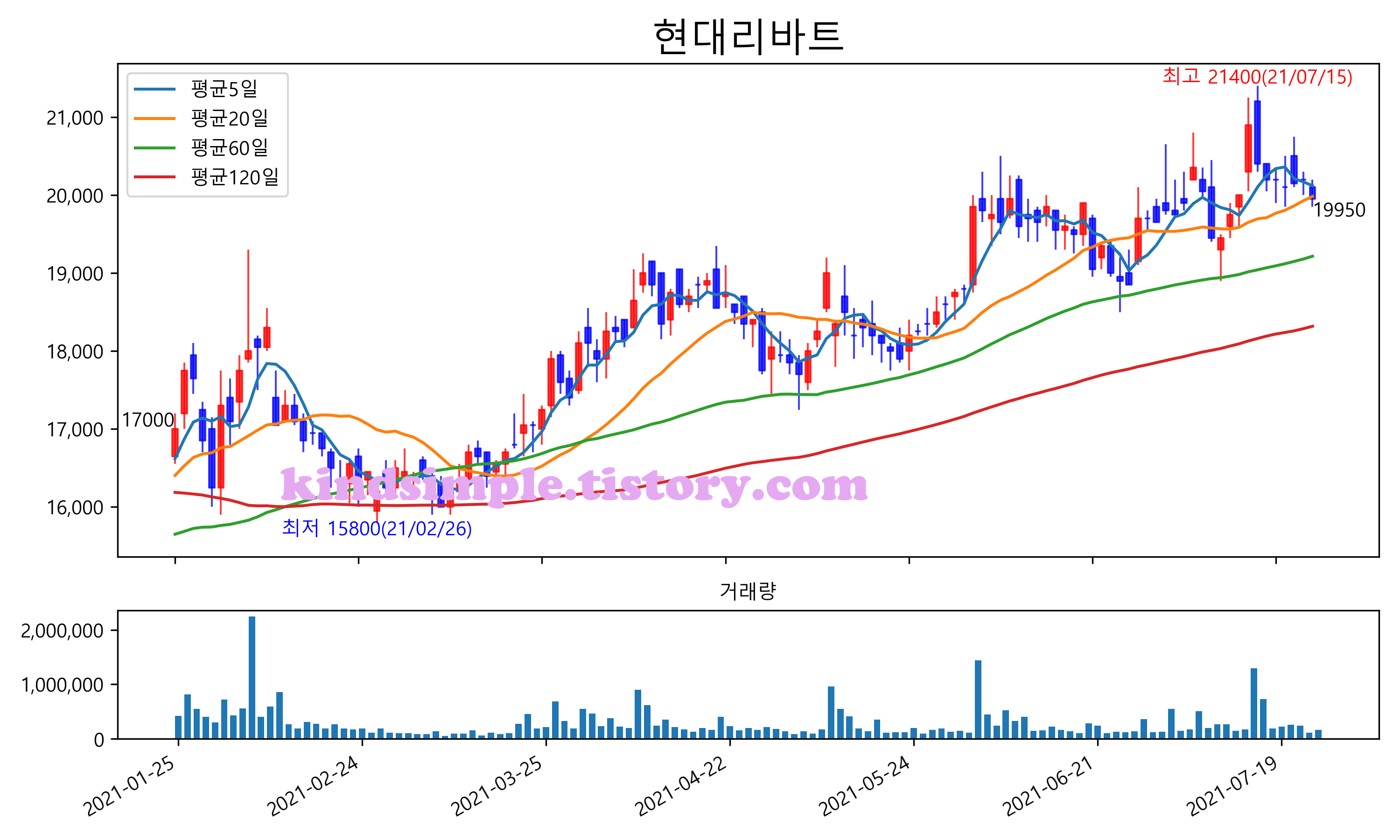 최근 6개월간 캔들차트 및 이동평균선입니다.