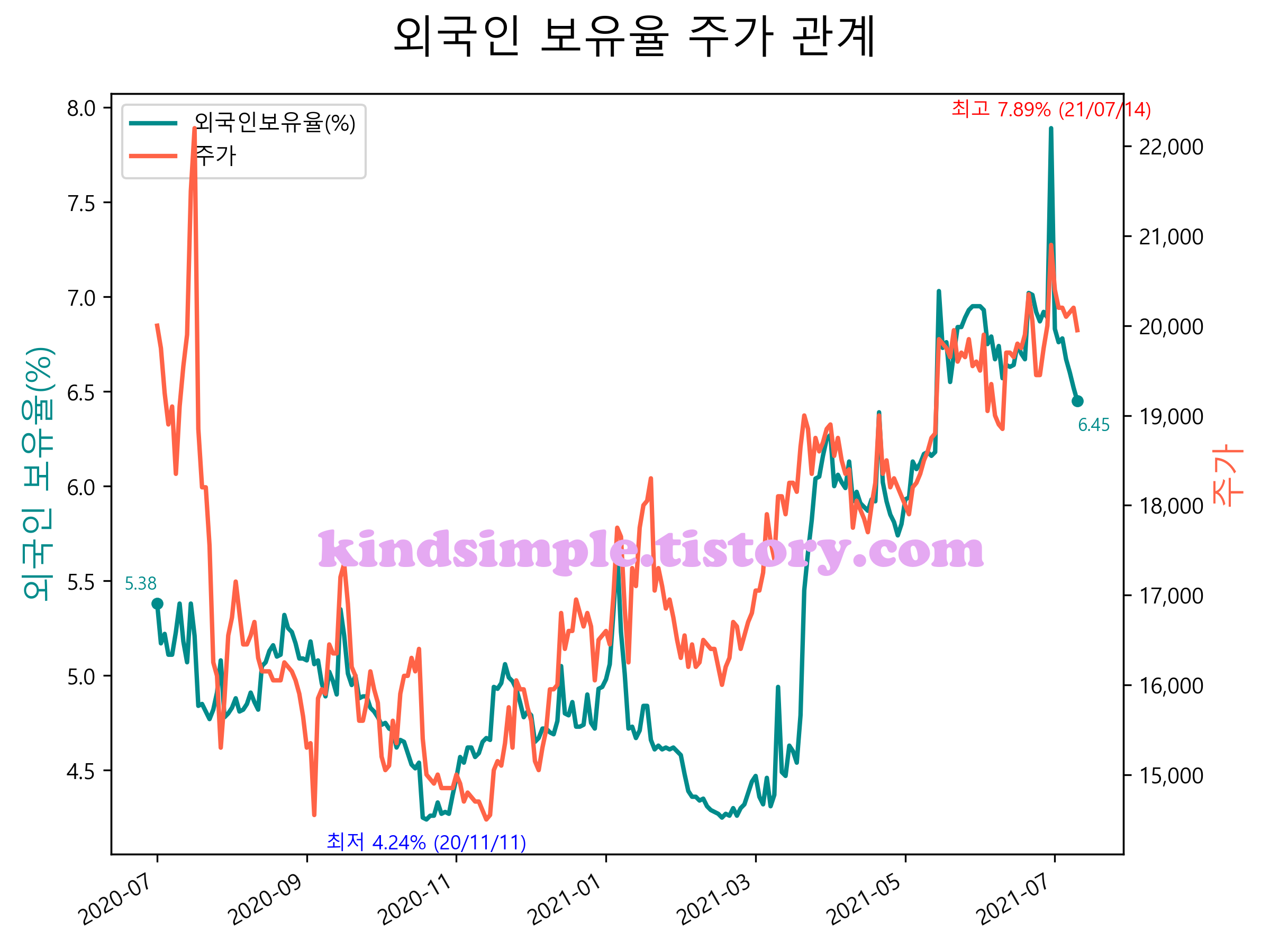 최근 1년간 외국인 보유율 및 주가와의 관계입니다.
