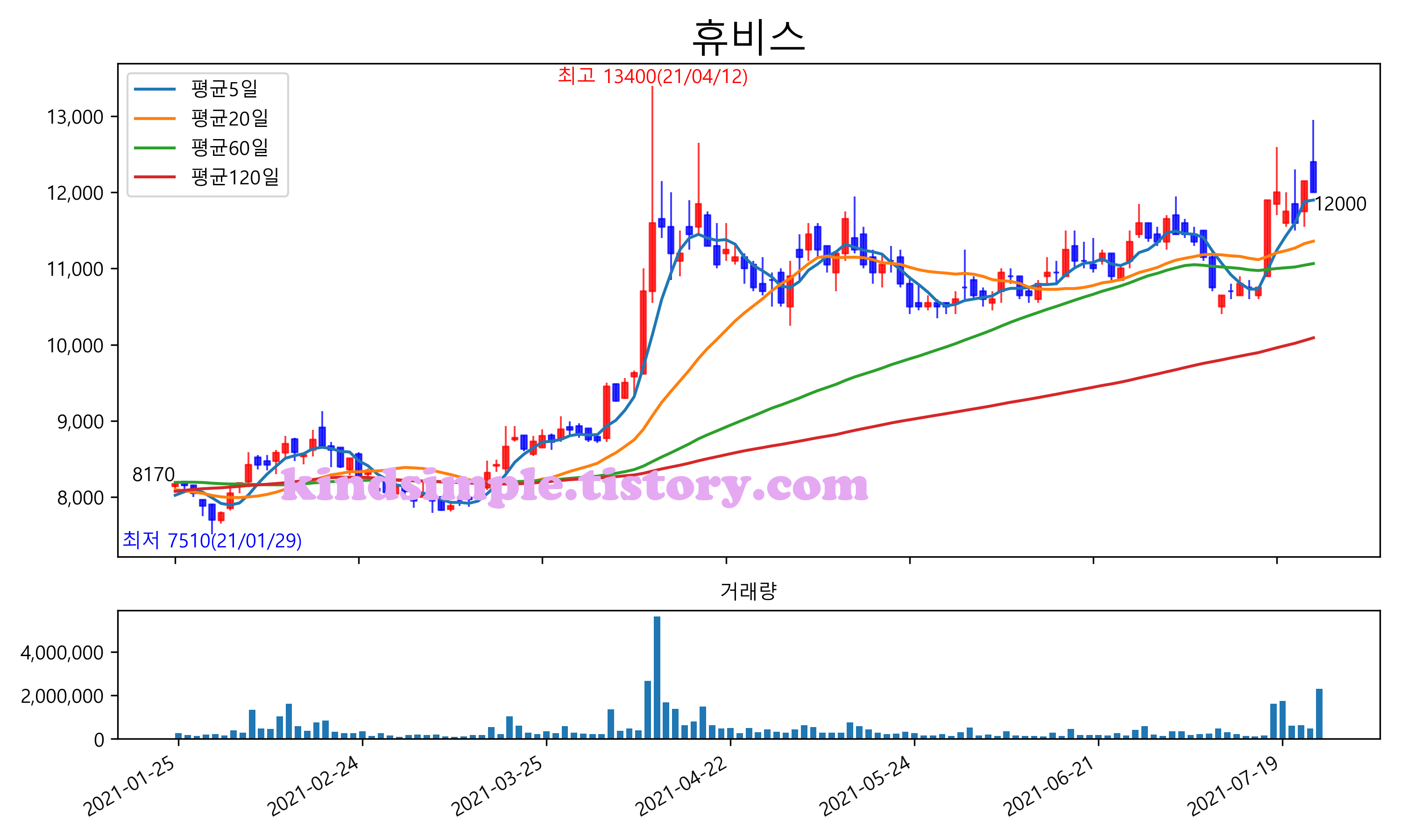 최근 6개월간 캔들차트 및 이동평균선입니다.