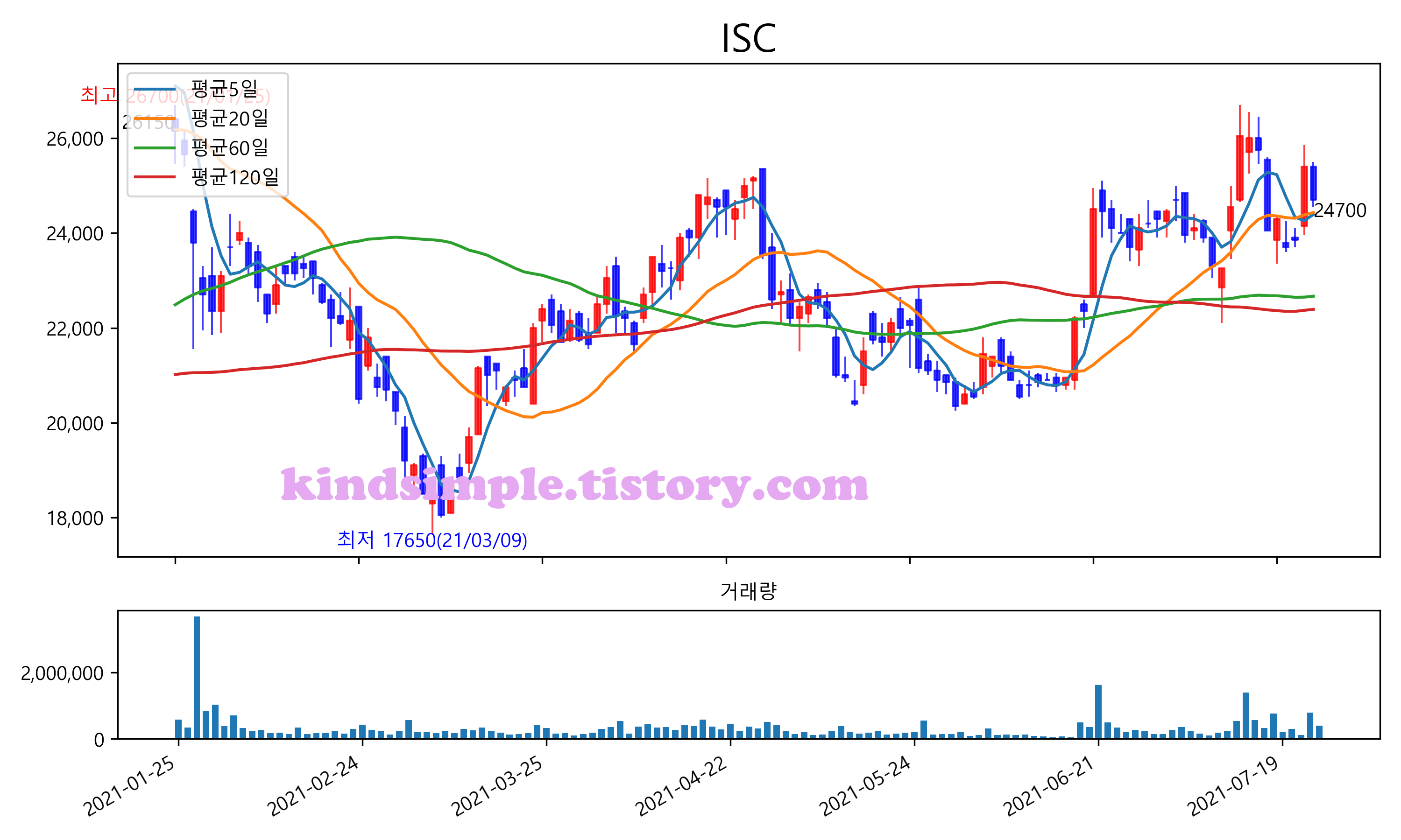 최근 6개월간 캔들차트 및 이동평균선입니다.