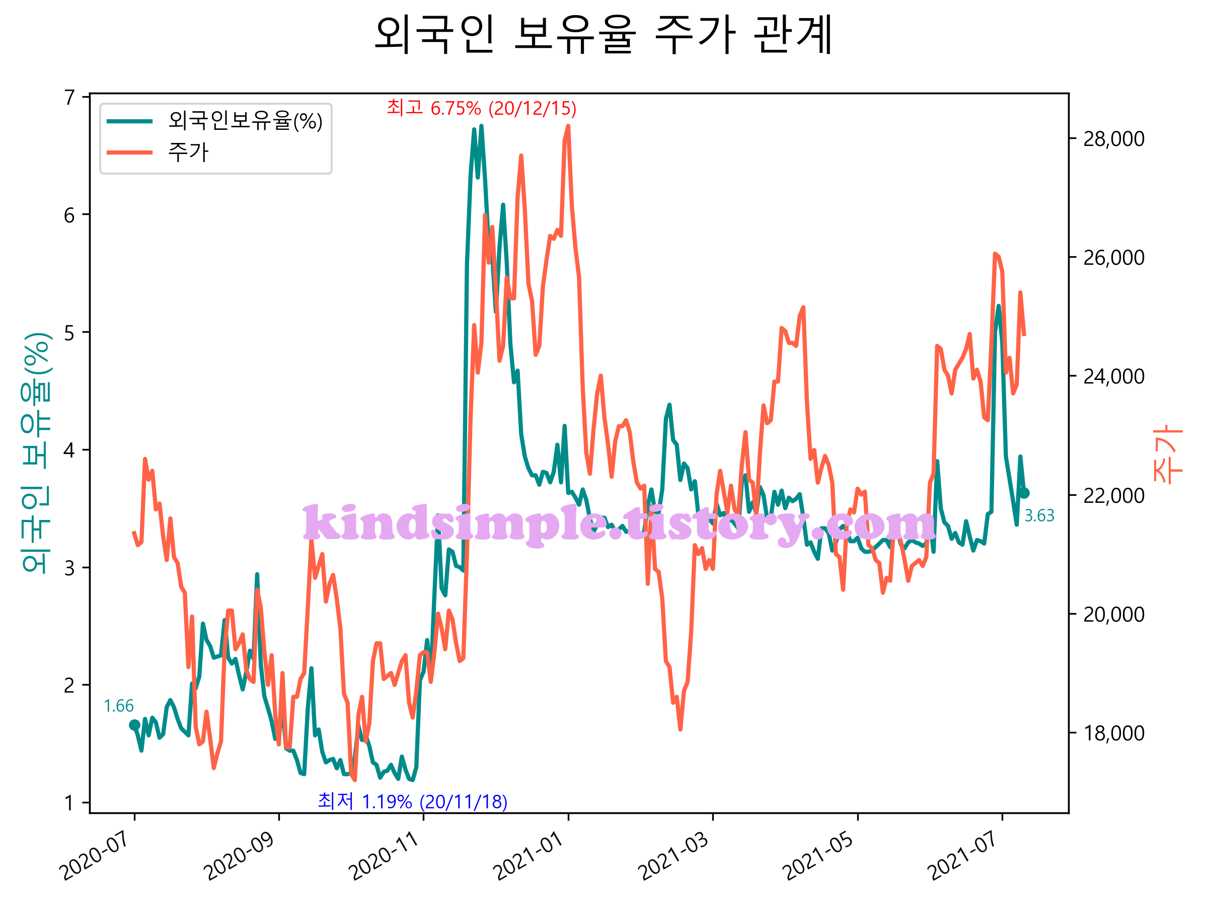 최근 1년간 외국인 보유율 및 주가와의 관계입니다.