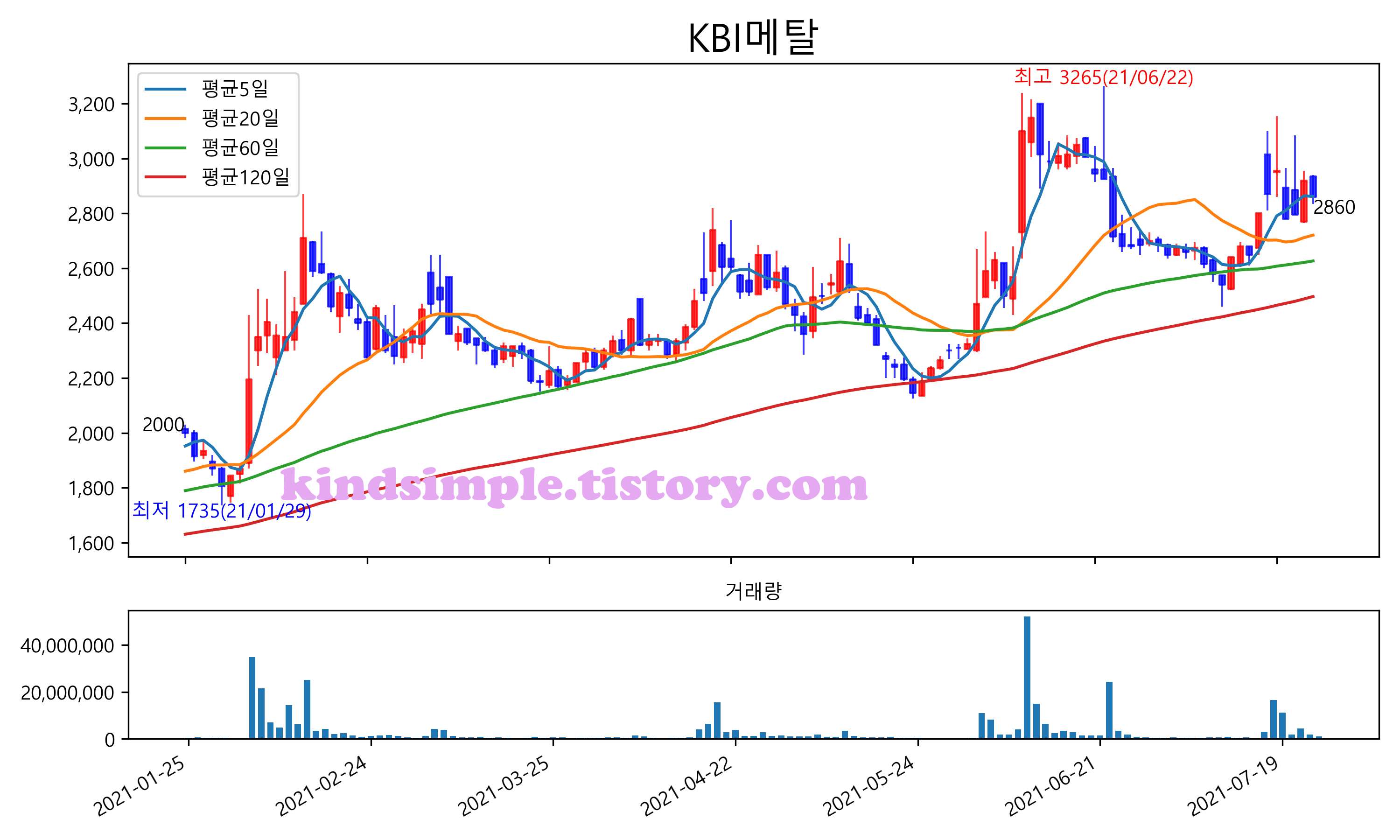 최근 6개월간 캔들차트 및 이동평균선입니다.