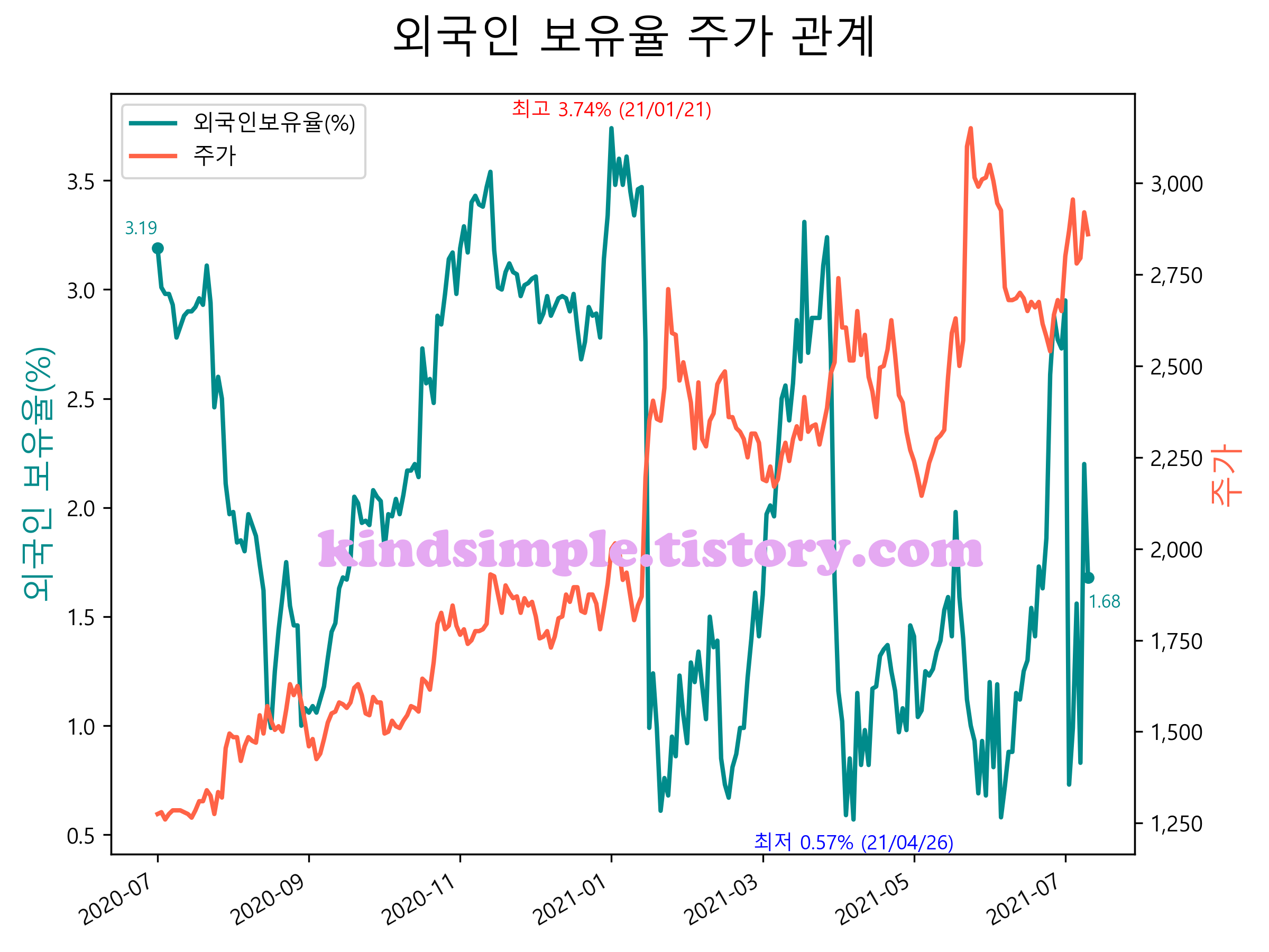 최근 1년간 외국인 보유율 및 주가와의 관계입니다.