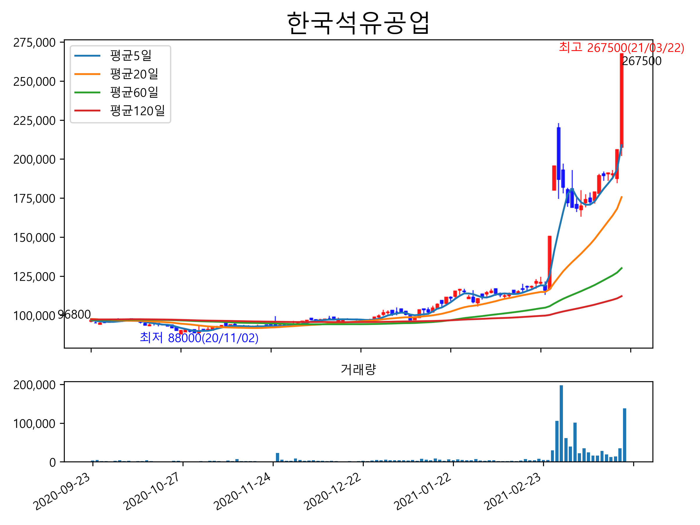 최근 6개월간 캔들차트 및 이동평균선입니다.