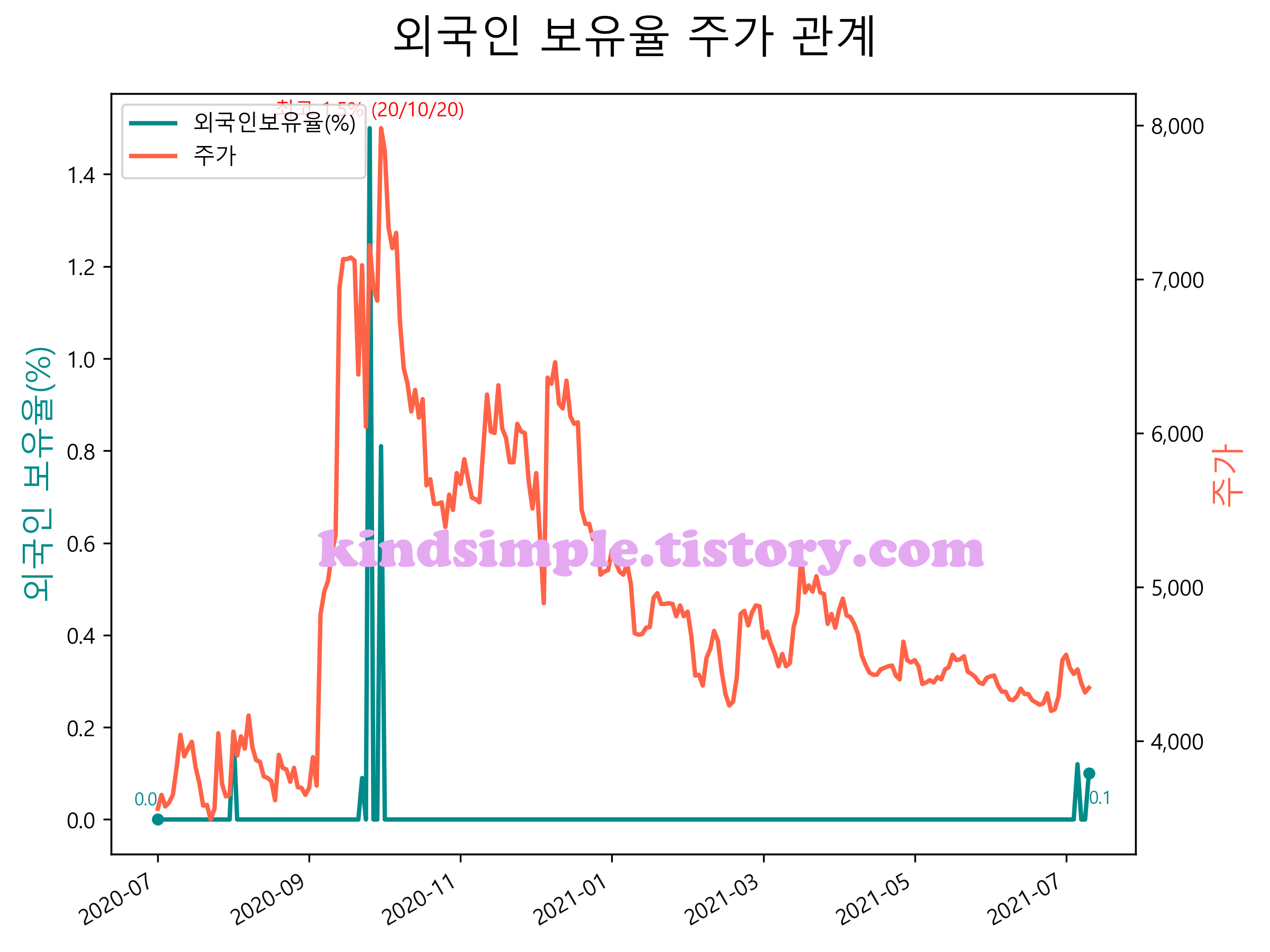 최근 1년간 외국인 보유율 및 주가와의 관계입니다.