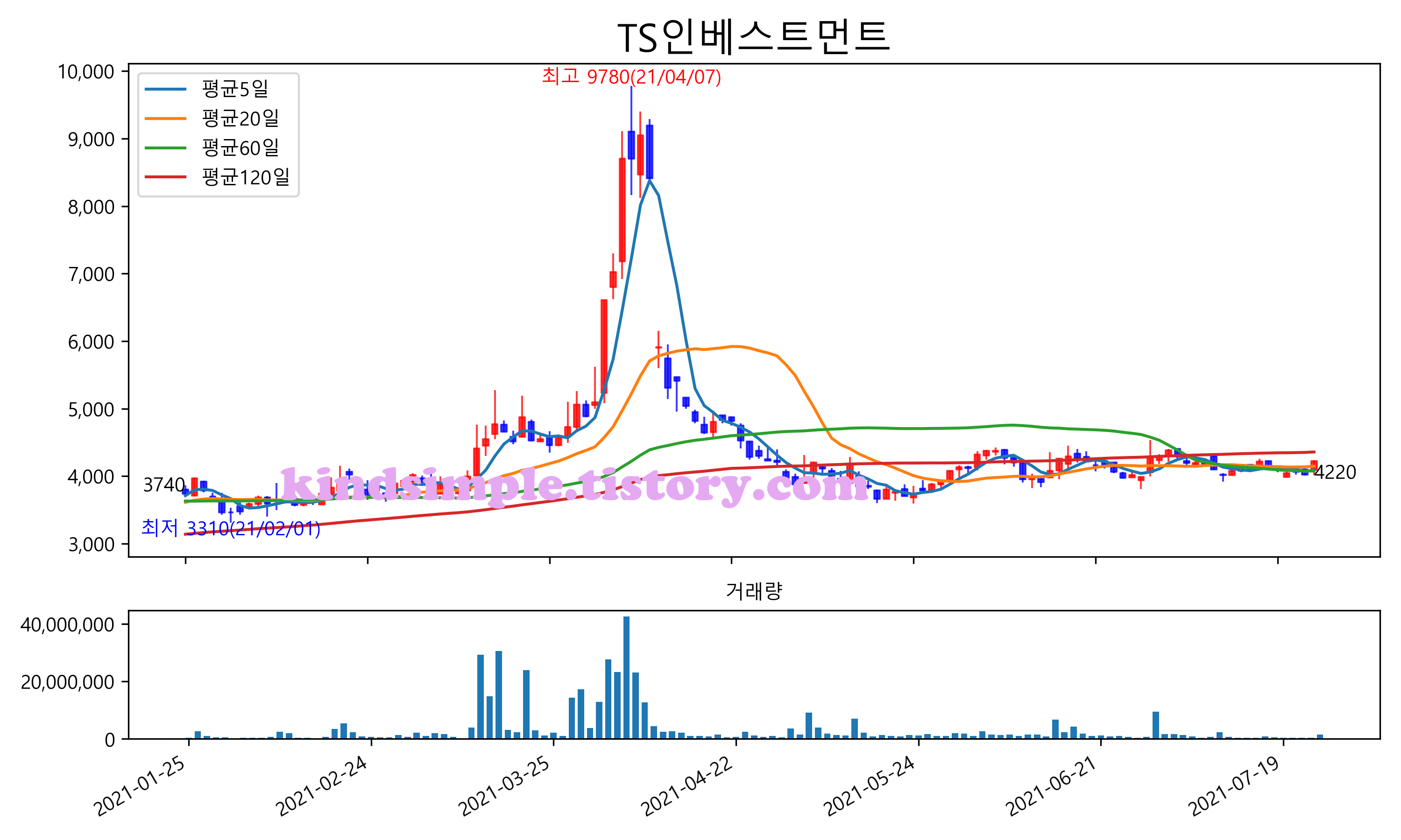 최근 6개월간 캔들차트 및 이동평균선입니다.