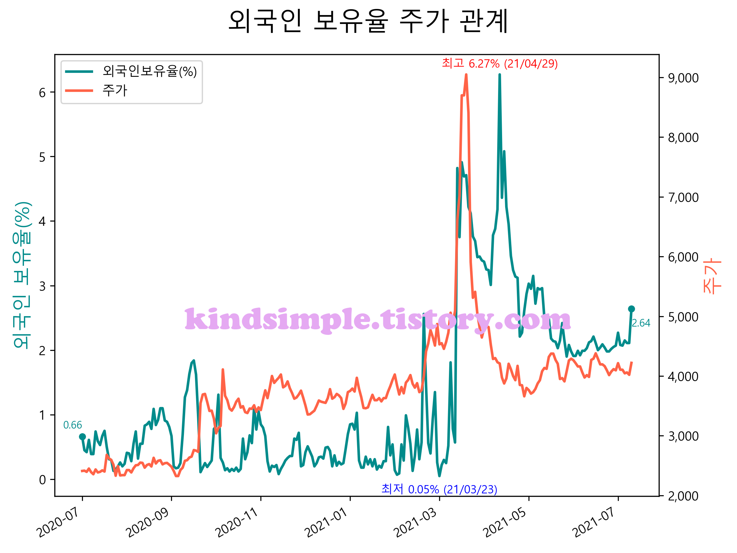 최근 1년간 외국인 보유율 및 주가와의 관계입니다.