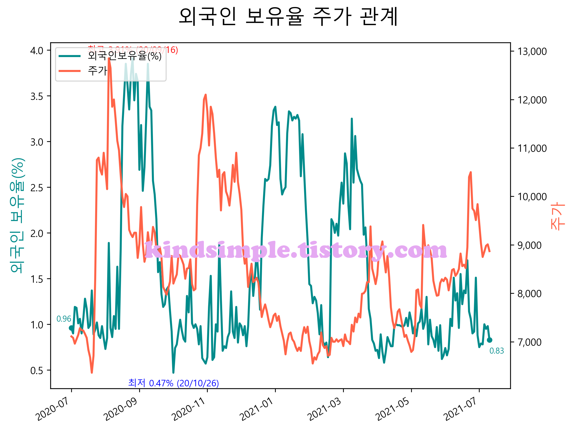 최근 1년간 외국인 보유율 및 주가와의 관계입니다.
