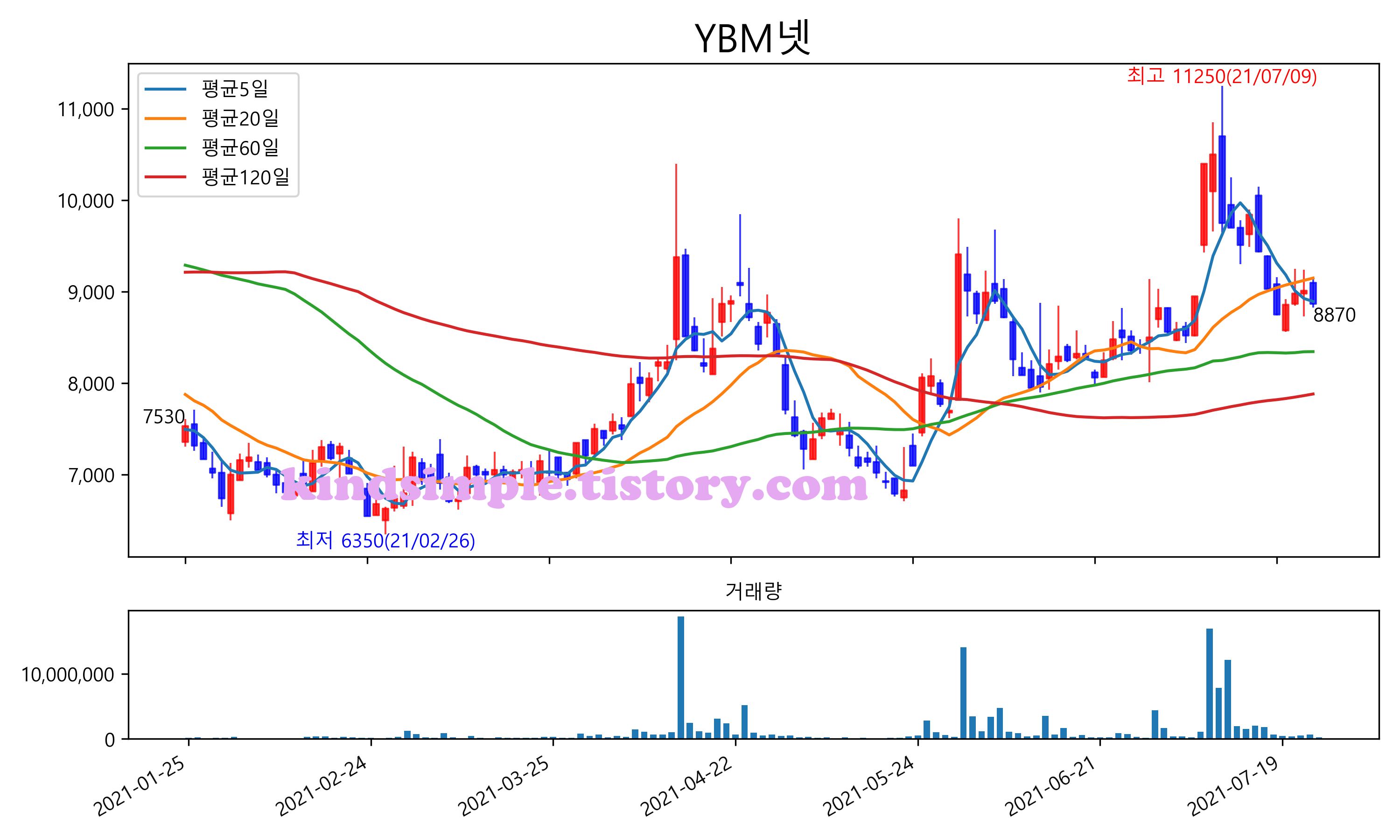 최근 6개월간 캔들차트 및 이동평균선입니다.