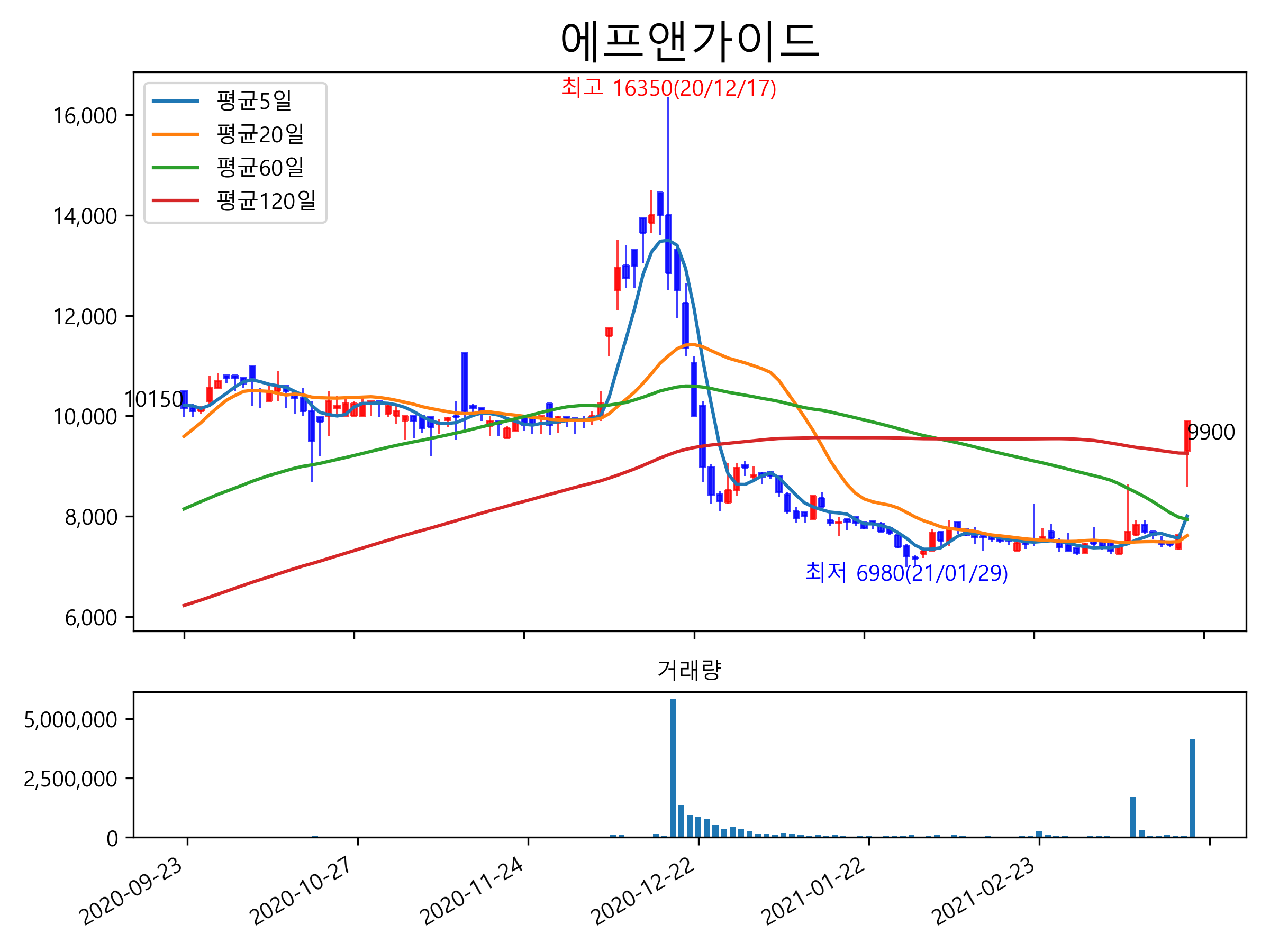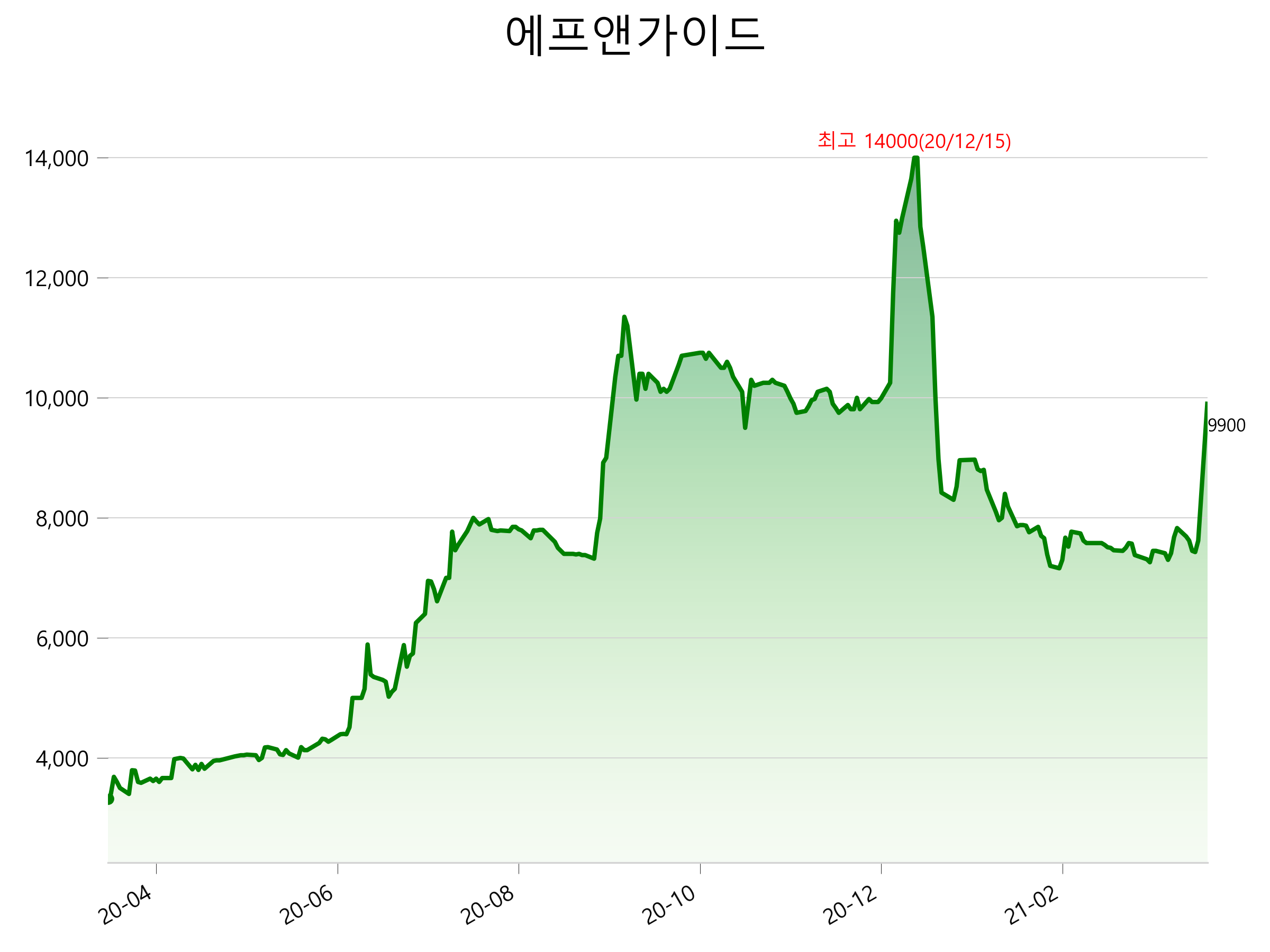 윤석열 전 검찰총장과 조금이라도 관련이 있으면 주가가 급등하는 영향을 보이는데, 에프앤가이드 역시 이와 같은 영향을 받았습니다. 작년 12월 17일 이후 3개월만에 최고가입니다.