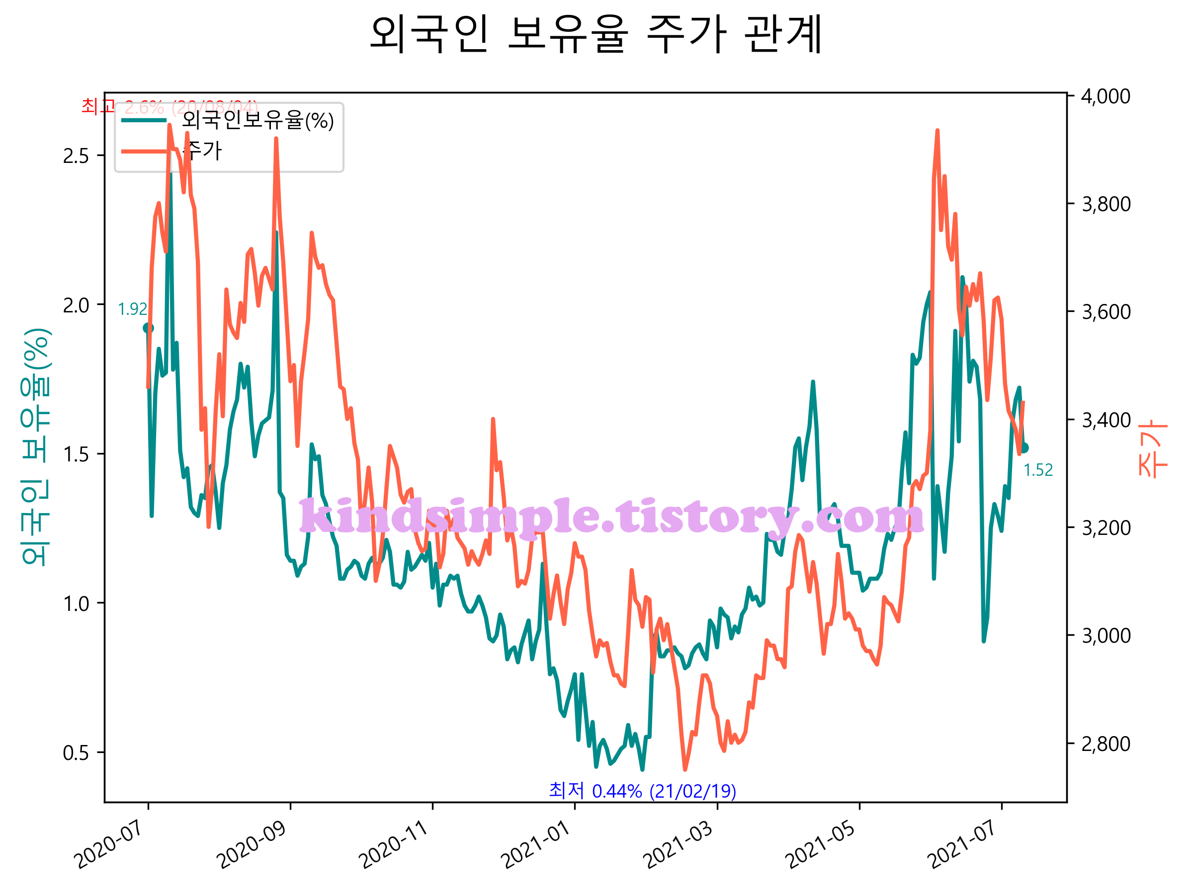 최근 1년간 외국인 보유율 및 주가와의 관계입니다.