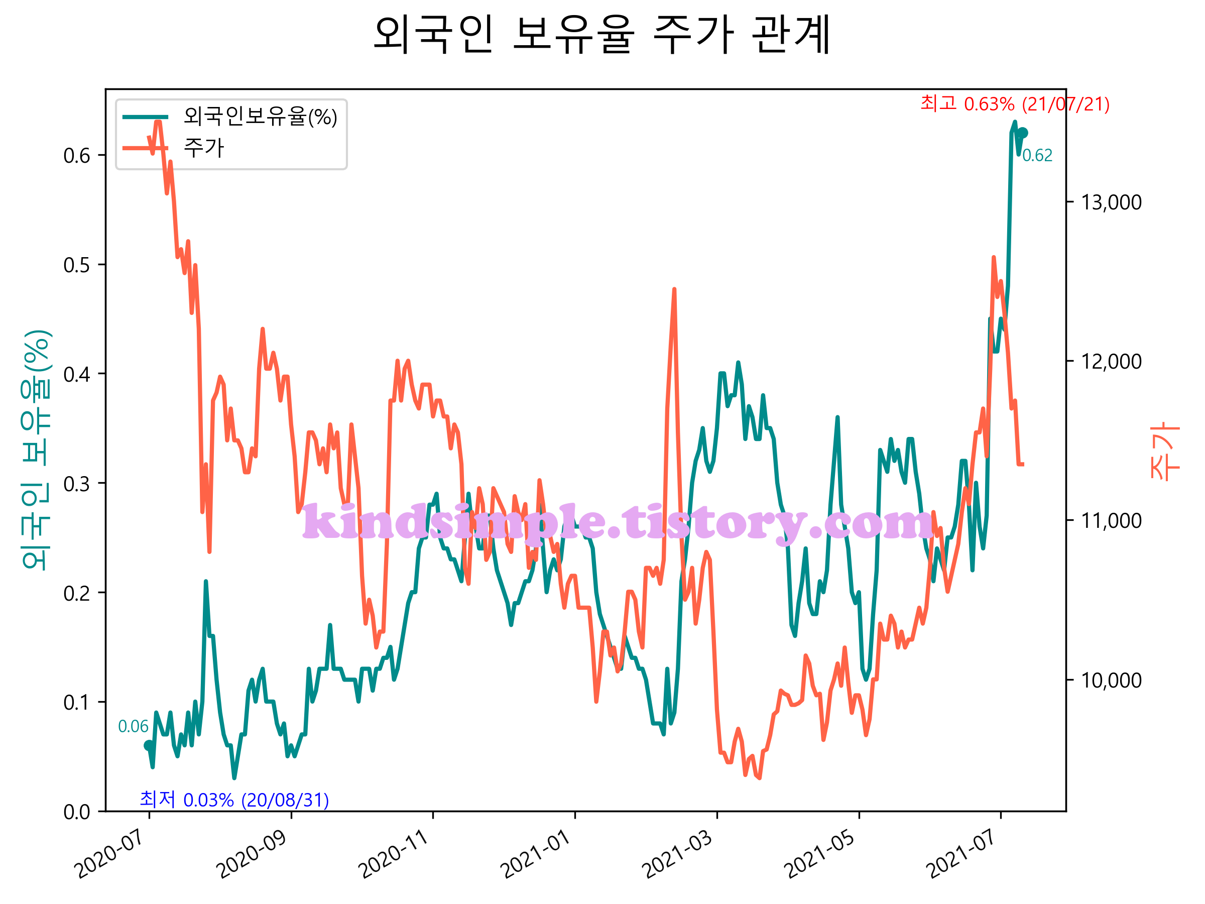 최근 1년간 외국인 보유율 및 주가와의 관계입니다.