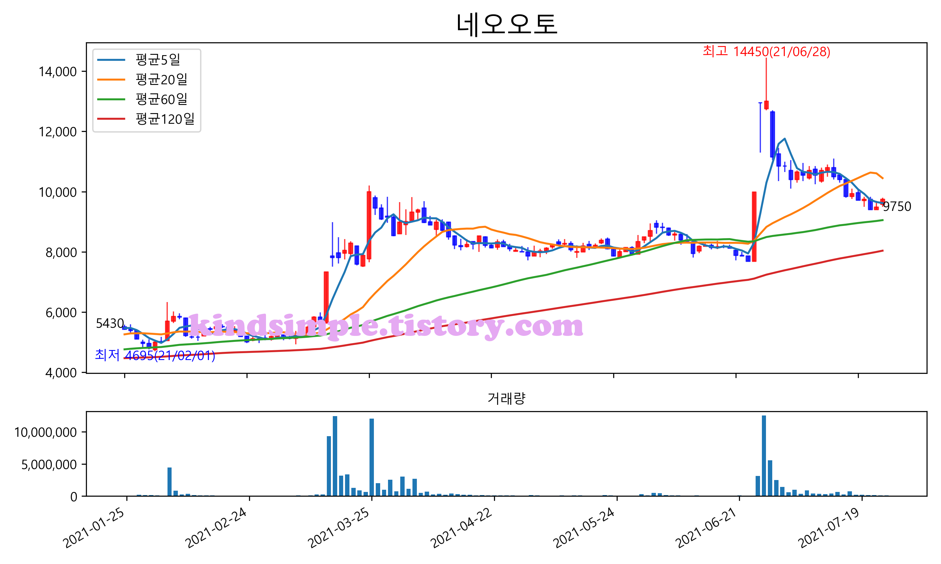 최근 6개월간 캔들차트 및 이동평균선입니다.