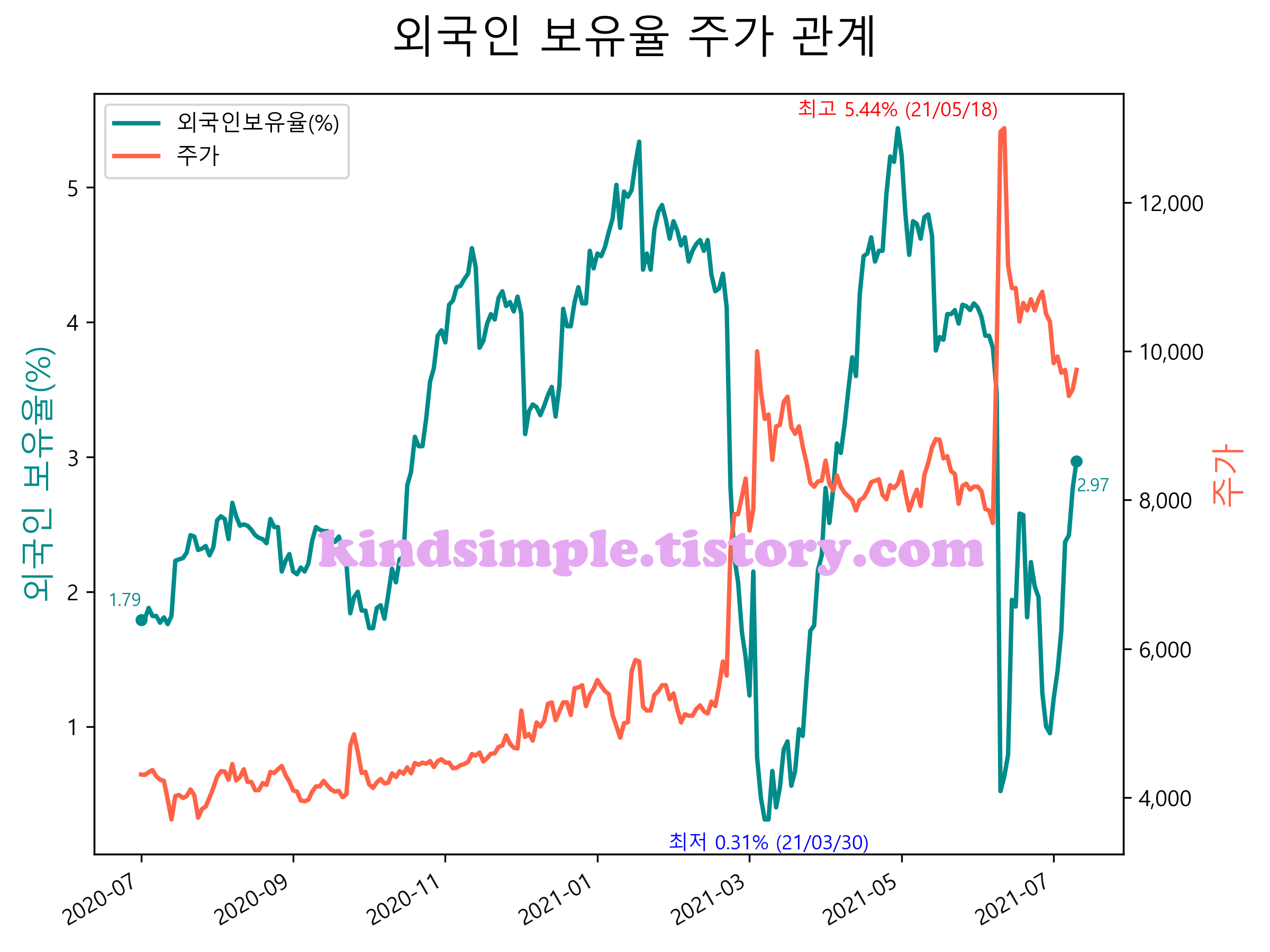 최근 1년간 외국인 보유율 및 주가와의 관계입니다.