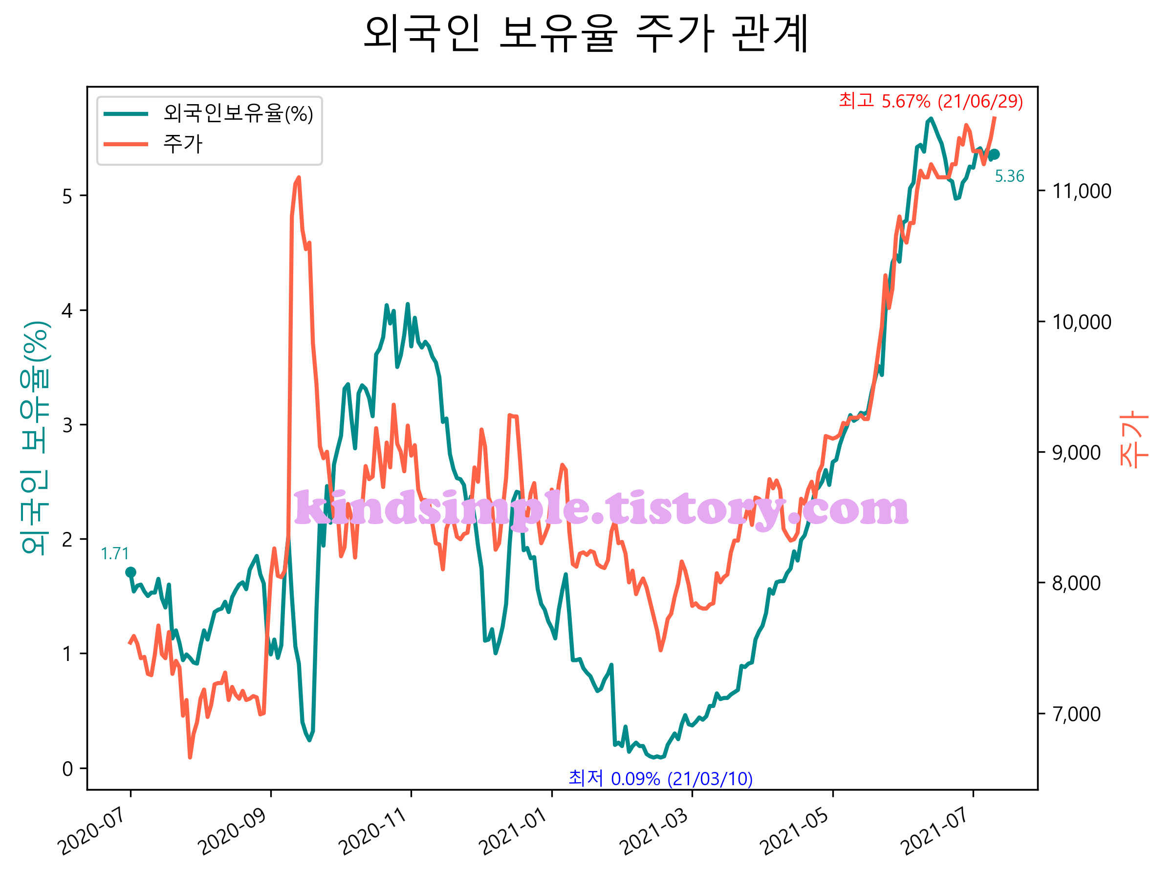 최근 1년간 외국인 보유율 및 주가와의 관계입니다.