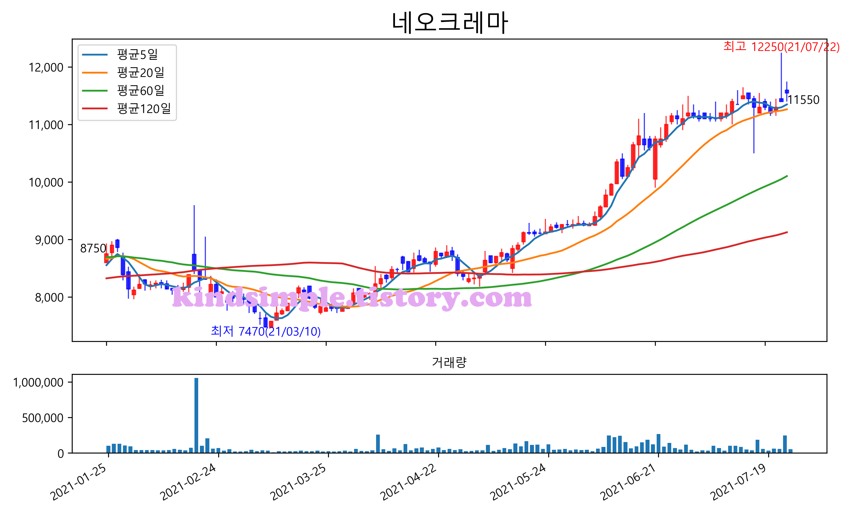 최근 6개월간 캔들차트 및 이동평균선입니다.
