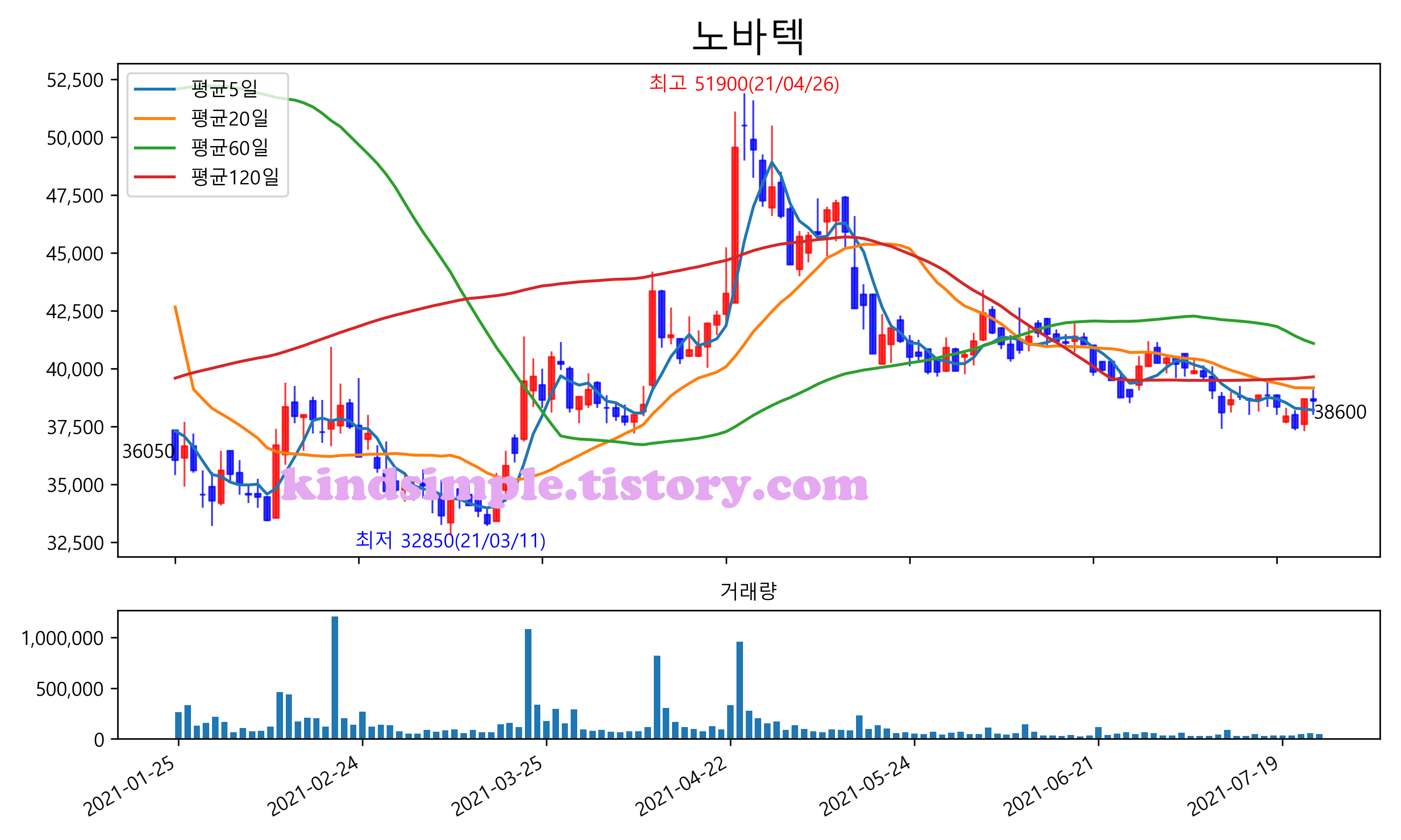 최근 6개월간 캔들차트 및 이동평균선입니다.