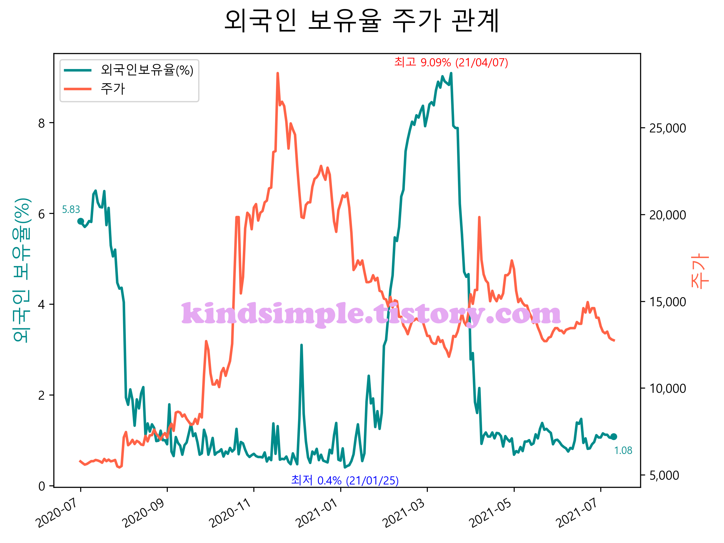 최근 1년간 외국인 보유율 및 주가와의 관계입니다.